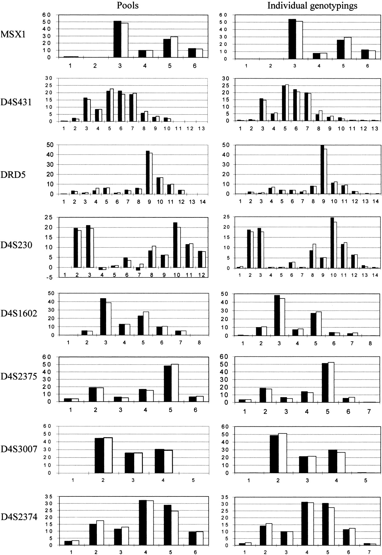 Allele frequency distributions in parents and their children predicted from pools after correction for stutter and differential amplification (left) and actual allele frequencies produced from individual genotyping (right). (Solid bars) Affected children; (open bars) parents; (horizontal axis) allele numbers; (vertical axis) allele frequency (%). The two negative results for D4S230 are due to overcorrection for stutter of some very rare alleles (<1%). In the analysis these values are taken as zero, but we show the real results in order to highlight this potential problem.