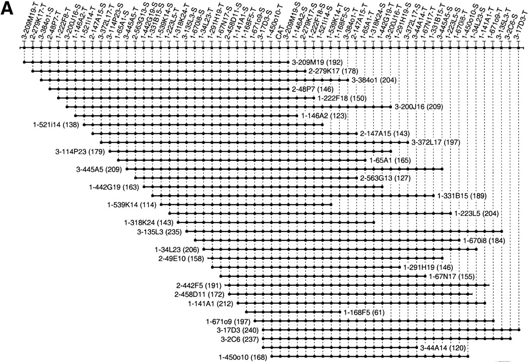 Three 400-kb high-resolution end probe-based BAC–PAC contigs in murine CAT (A), IGFBP1 (B), and MLR (C) gene regions. The contigs have been assembled according to the hybridization results using SEGMAP contig assembly software. The deduced markers are depicted along the top and each short horizontal line with black circles represents PAC or BAC clones. The clone names are represented by the library name, plate number, and well position, e.g., 3-209M19 stands for RPCI-23 library, plate-209, M19 well. RPCI-21, RPCI-22, and RPCI-23 are shortened to 1, 2, and 3. The T7 and SP6 end markers are condensed as -T and -S after the clone name. The size of each clone is indicated in kb in parenthesis. Because the markers are spaced evenly in the contigs, the length of the horizontal line does not represent the clone size accurately. The dotted line in the IGFBP1 contig (B) indicates the partly chimeric clone 1-221A10. The black squares in B and C represent an identical clone end among neighboring clones. A unique marker was not designed from these ends because of the presence of repetitive sequence. However, these end sequences were used to ascertain additional 10 nonchimeric clones.