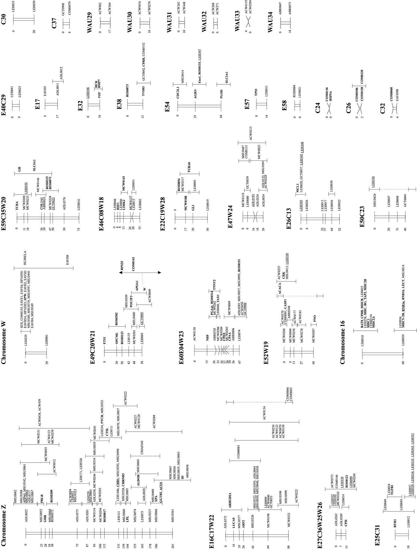 Framework consensus linkage map of the chicken genome. The framework loci (loci whose order relative to one another is supported by odds >3, Keats et al. 1991) have been ordered and their position is indicated by the number at left. The possible location of the loci whose order is not supported by odds >3 is indicated by an error bar. Loci that have been mapped cytogenetically are underlined; those known to represent expressed sequences (identified genes and ESTs) are shown in boldface type.