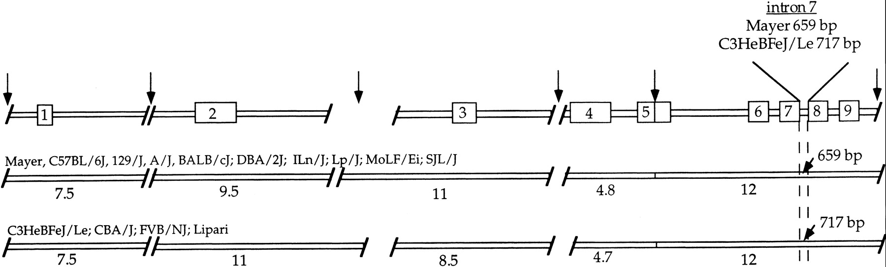Genomic organization of Mgf. Partial EcoRI restriction map. Arrows indicate sites of EcoRI restriction enzyme sites. Numbered and intervening boxes represent exons and introns, respectively. Gaps between boxes indicate that additional sequences could be located within this region as total genomic DNA and not a physical clone was used for mapping. Therefore, all fragments may not be identified by Southern blot analysis. Open boxes below represent the structure seen in C57BL/6J/Mayer and C3H, respectively. Numbers below open boxes represent the size of the EcoRI restriction fragments observed for the given fragments. A size polymorphism exists in intron 7 consisting of a repeat expansion and extensive sequence diversity.