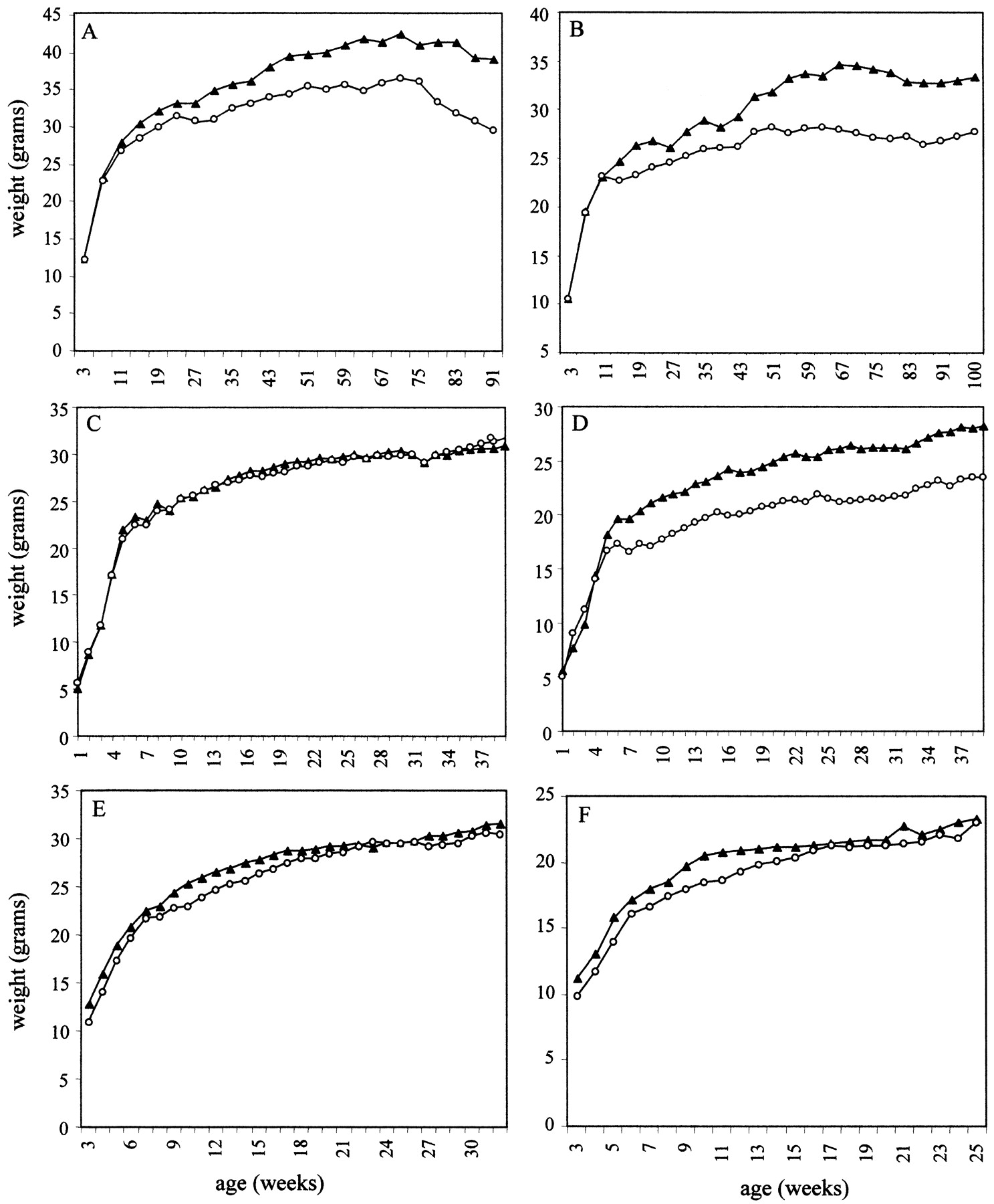 Total body weight of male (A,C,E) and female (B,D,F) mice in different genetic backgrounds: (A,B) RI; (C,D)W9.5; and C57 (E,F) C57. At least four animals were used for each time point. Age of the animals was determined from birth. (▴) +/+ animals; (○) −/− animals.