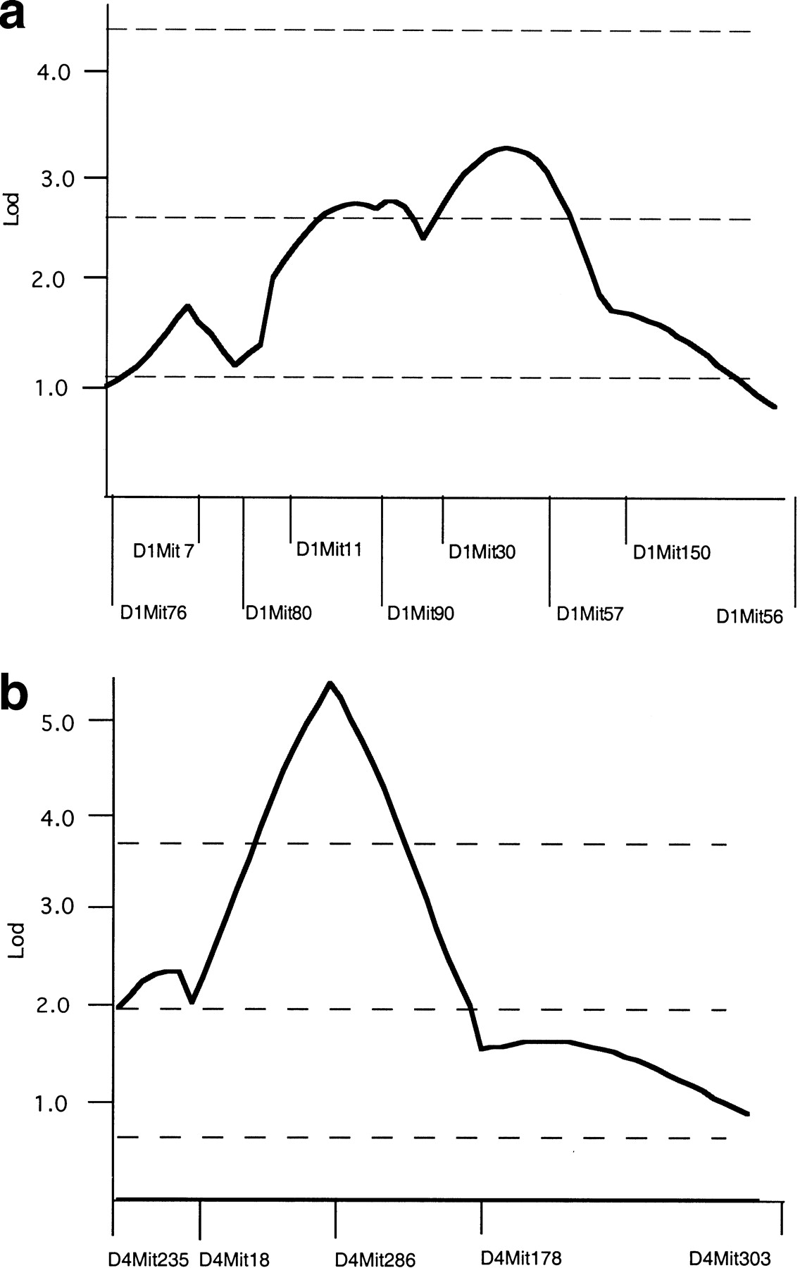 QTL analysis. (a) MapManager QT was used to analyze chromosome 1 genotype and trait data from affected F2 progeny of a cross between C57BL/6J jck/+ and DBA/2J jck/+ mice. (b) MapManager QT was used to analyze chromosome 4 genotype and trait data from affected F2 progeny of a cross between B6 jck/jck and D2.B6 chr1 congenic mice. For both analyses, a permutation test was used to calculate the threshold levels indicated for suggestive, significant, and highly significant linkage (dotted lines).