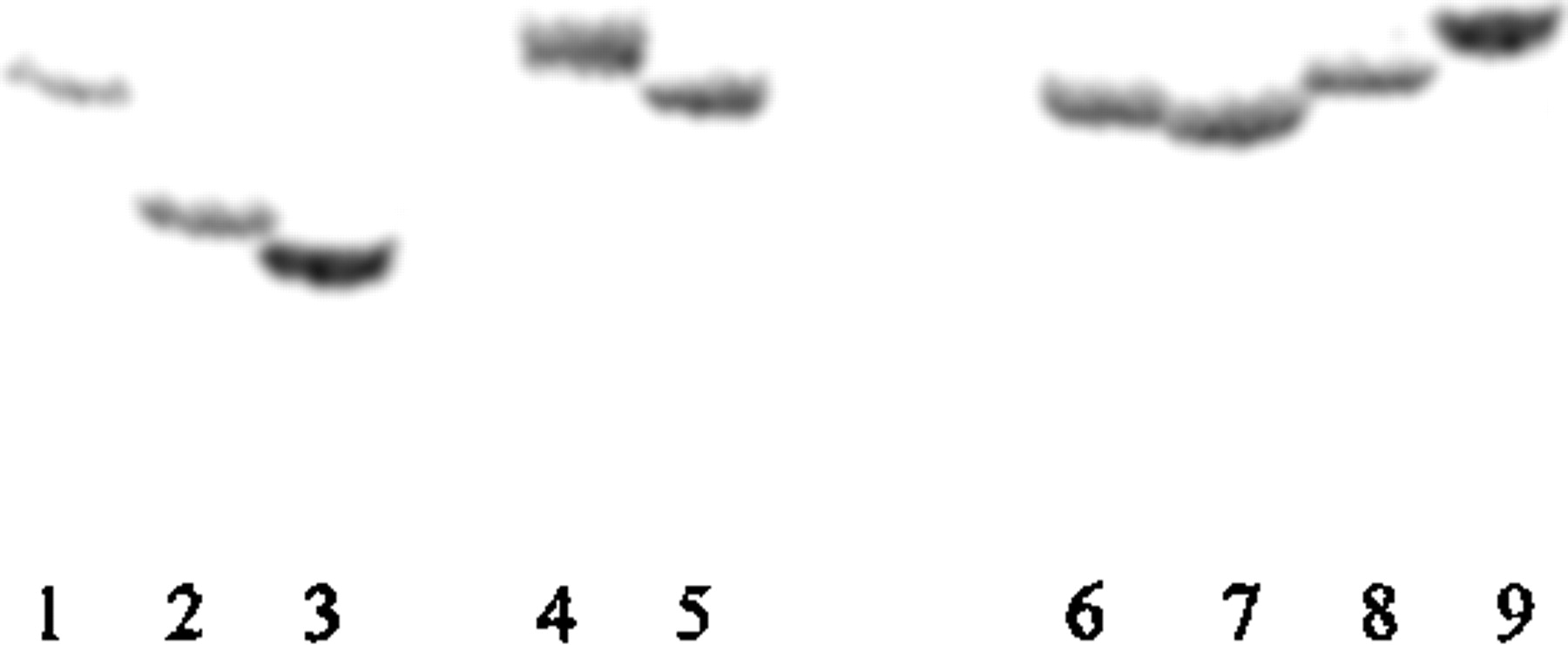 Mobility differences in PCR products harboring specific SSR tracts among strains of E. coli following electrophoresis in a 5% acrylamide TBE denaturing sequencing gel. PCR was performed using primer pairs, one radiolabeled, flanking the poly(G) tract at a genomic site ∼77 bp upstream from the ATG site of the ycgW locus. The dried gel was exposed to a PhosphorImager. The expected size of theE. coli K12 amplification product was 200 bp. Shown are amplification products for the following strains: (lane 1) K12:DH5α; (lane 2) B:SR9c; (lane 3) B:SR9b; (lane4) ETEC:O78:H [E10407]; (lane 5) EPEC: O111[E639616]; (lane 6) E:1; (lane 7) E:7; (lane 8) E:18; (lane 9) E:47.