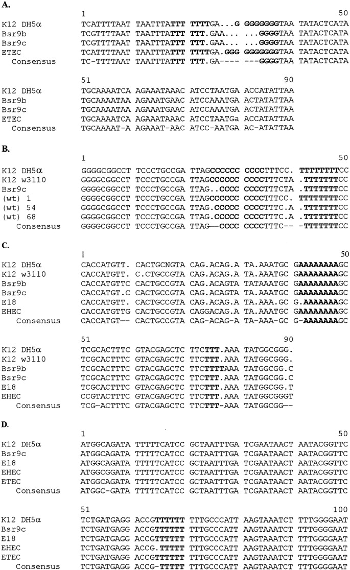 DNA sequence alignments for complementary DNA strands for four loci bearing mononucleotide repeat polymorphisms among strains of E. coli. PCR products were sequenced using the dideoxy-chain termination method and aligned using the Pile-up GCG program. Polymorphic SSR tracts are shown in boldface letters. (A) Poly(G) tract 77 bp and poly(T) tract 84–89 bp upstream of the ATG element of ycgW; (B) poly(C) tract ∼90 bp and poly(T) tract 76 bp upstream of the ATG element of yaiN; (C) poly(A) tract 35 bp and poly(T) tract 67 bp downstream of the tRNA gene serW; (D) poly(T) tract 38 bp upstream of the ATG element of caiF.