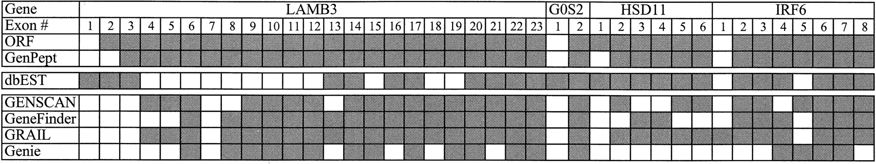 Comparison of gene recognition programs. Genomic sequences containing the indicated genes were analyzed for exon content with the suite of programs contained in Genotator. Exons for each gene are numbered. Those that contain part of the translated ORFs are shaded. All other shaded boxes indicate a hit with the indicated analysis program.