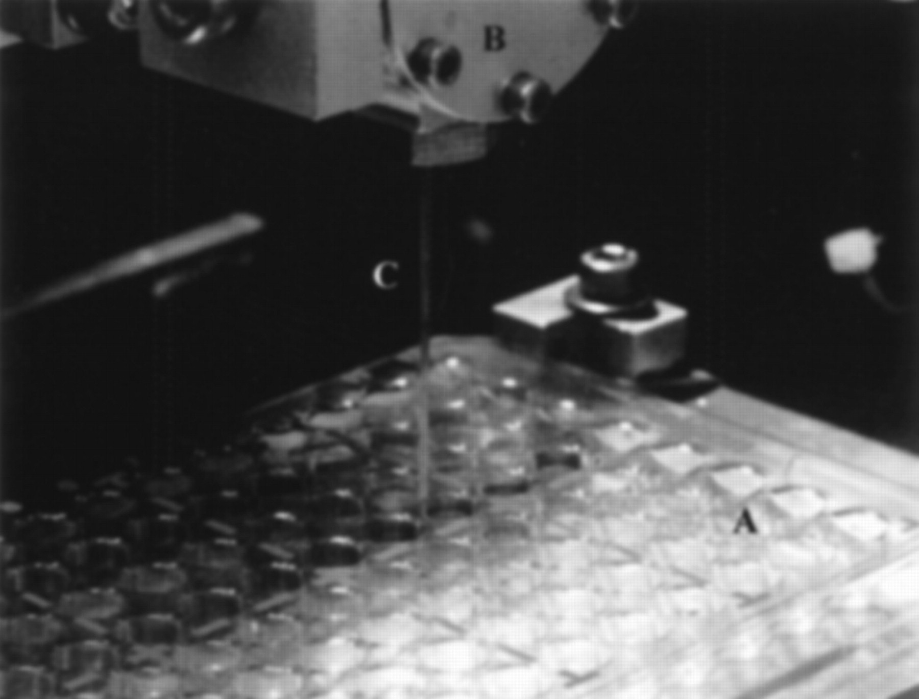 Input station for microplate of samples (A), aspirator (B) with capillary (C), and imager (above).