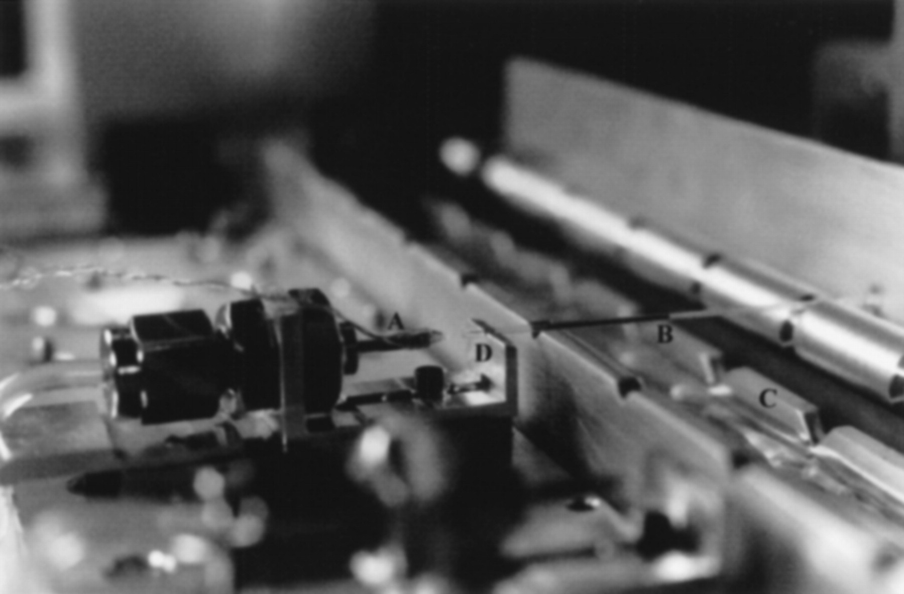 Piezoelectric reagent dispenser (A) dispensing fluids into the end of a 340-μm inner diameter glass capillary (B) on transport comb (C) and aligned with the capillary indexer (D).
