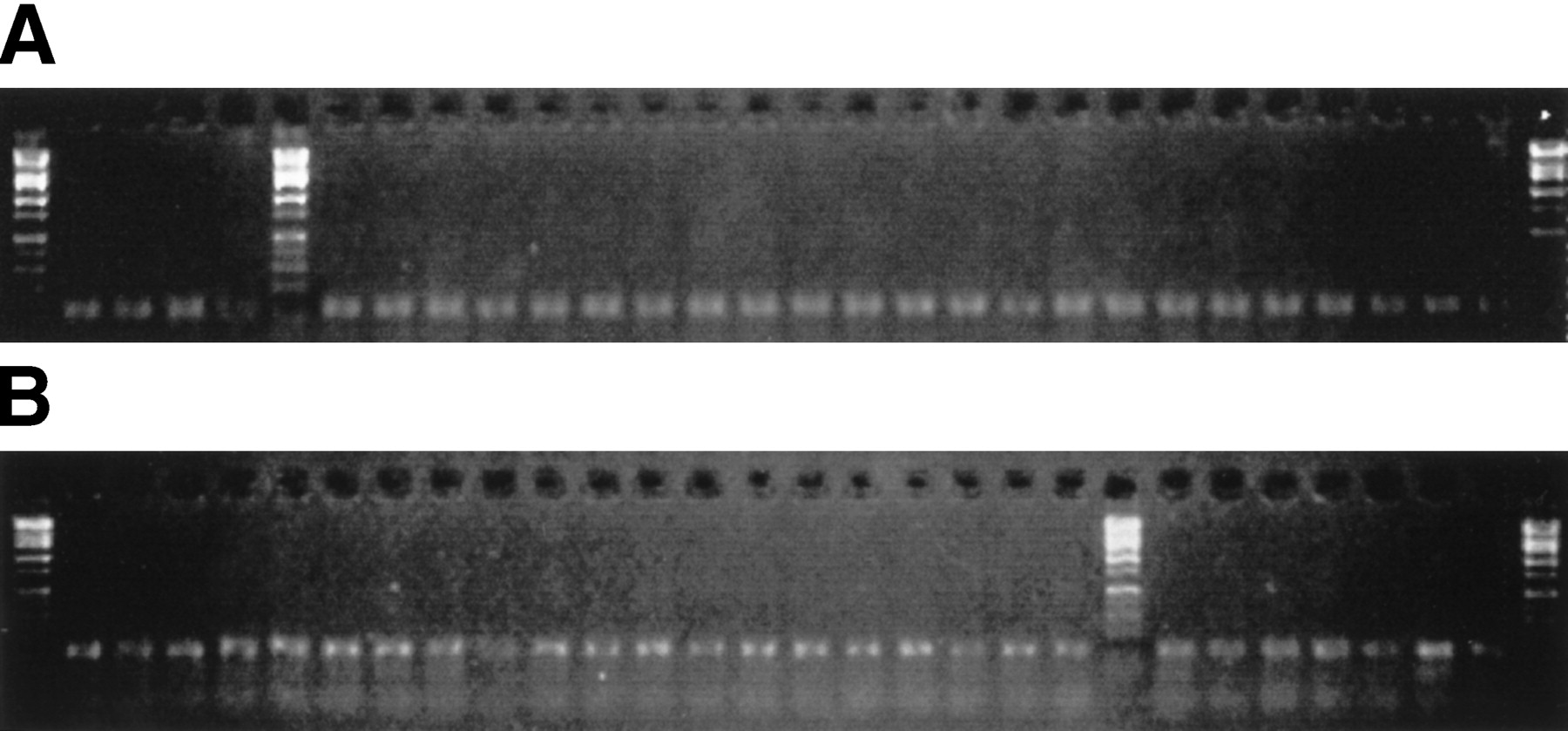 (A) PCR results from the first 100 capillaries in one day's run of 1000 capillaries on ACAPELLA-1K; (B) PCR results from the last 100 capillaries in the day's run. Little if any degradation of the PCR components occurrs over the course of an 8-hr day.