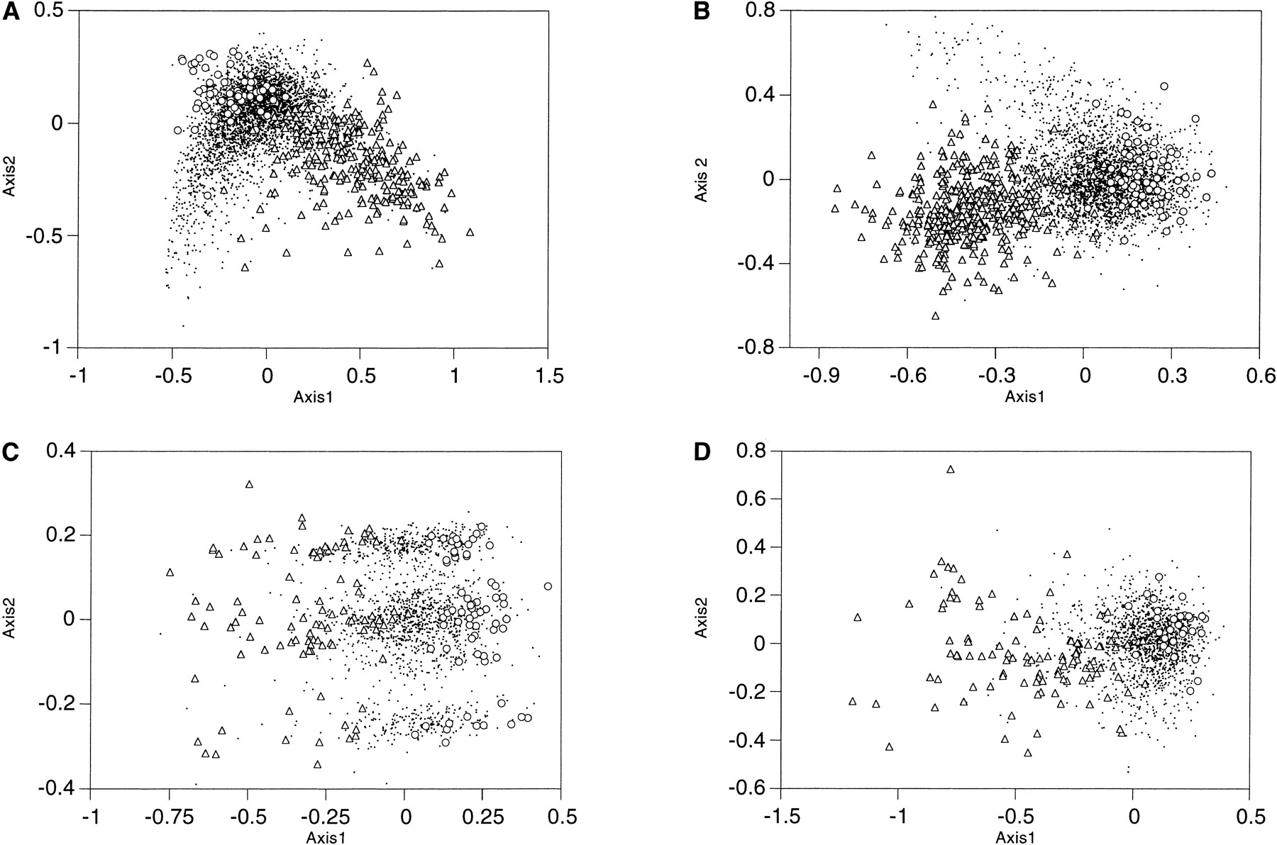 Correspondence analysis of relative synonymous usage for genes of (A) Escherichia coli, (B) Bacillus subtilis, (C) Thermotoga maritima, and (D) Methanobacterium thermoautotrophicum. Triangles correspond to genes proposed as being acquired by horizontal gene transfer and included in regions with a low G+C content. Circles correspond to genes proposed as being acquired by HGT and included in regions with a high G+C content. Dots correspond to genes that are not proposed as being acquired by HGT. For the sake of clarity, genes proposed as being acquired by HGT that do not belong to a region that is high or low in the G+C content are not shown.