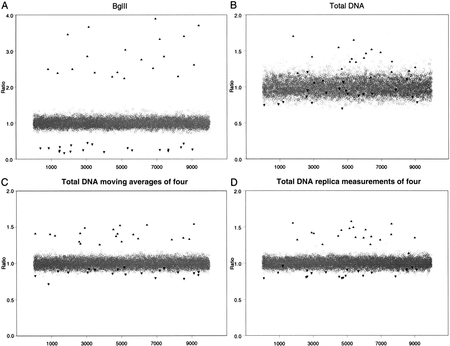 Simulations of microarray analysis of 10,000 probes where 20 probes are amplified fourfold and 20 probes are homozygously deleted. Either hybridization of BglII representations (A) or hybridization of total DNA (B–D) were modeled. The hybridization of total genomic DNA (B) also was modeled by moving averages of four (C) or replica measurements of four (D).