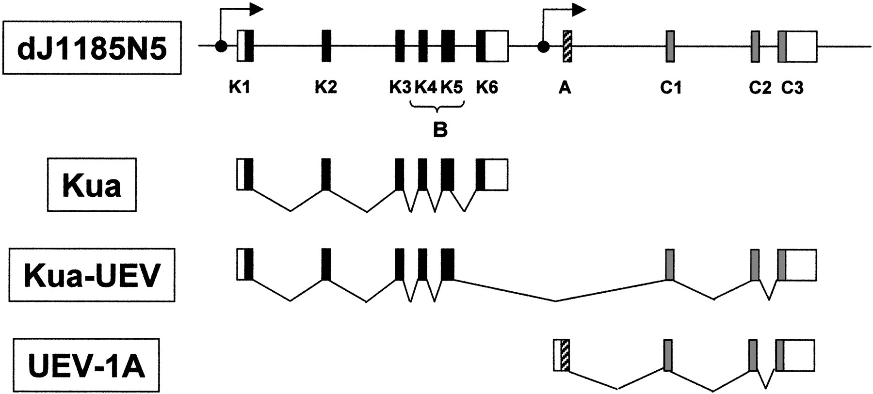 Diagrammatic representation summarizing the three major classes of transcriptional units generated at the Kua–UEV locus. Transcription from the promoter located upstream from the first exon ofKua can eventually yield either a Kua-only transcript ending in K6 (Kua), or a Kua–UEV hybrid transcript. The maturation of the longer transcript is possible only after removal of the K6 exon, which contains signals for truncation of the primary transcript. Transcription from the promoter located upstream from the A exon yields UEV1A. (Black boxes) Kua exons; (light grey boxes) UEV “common domain” exons; (shaded box)UEV “A” exon; (open boxes) 5′ and 3′ UTRs; (filled circles and arrows) putative transcription initiation sites.
