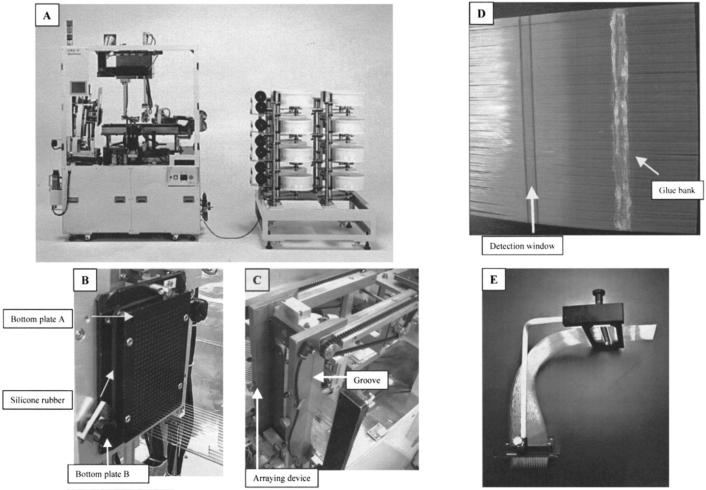 Photographs of the RISA capillary array assembler (CAS). (A) The RISA capillary array assembler. (B) Sixteen capillaries penetrating the silicone plate. (C) The arraying device. (D) Capillary sheet. (E) The 384-capillary cassette.