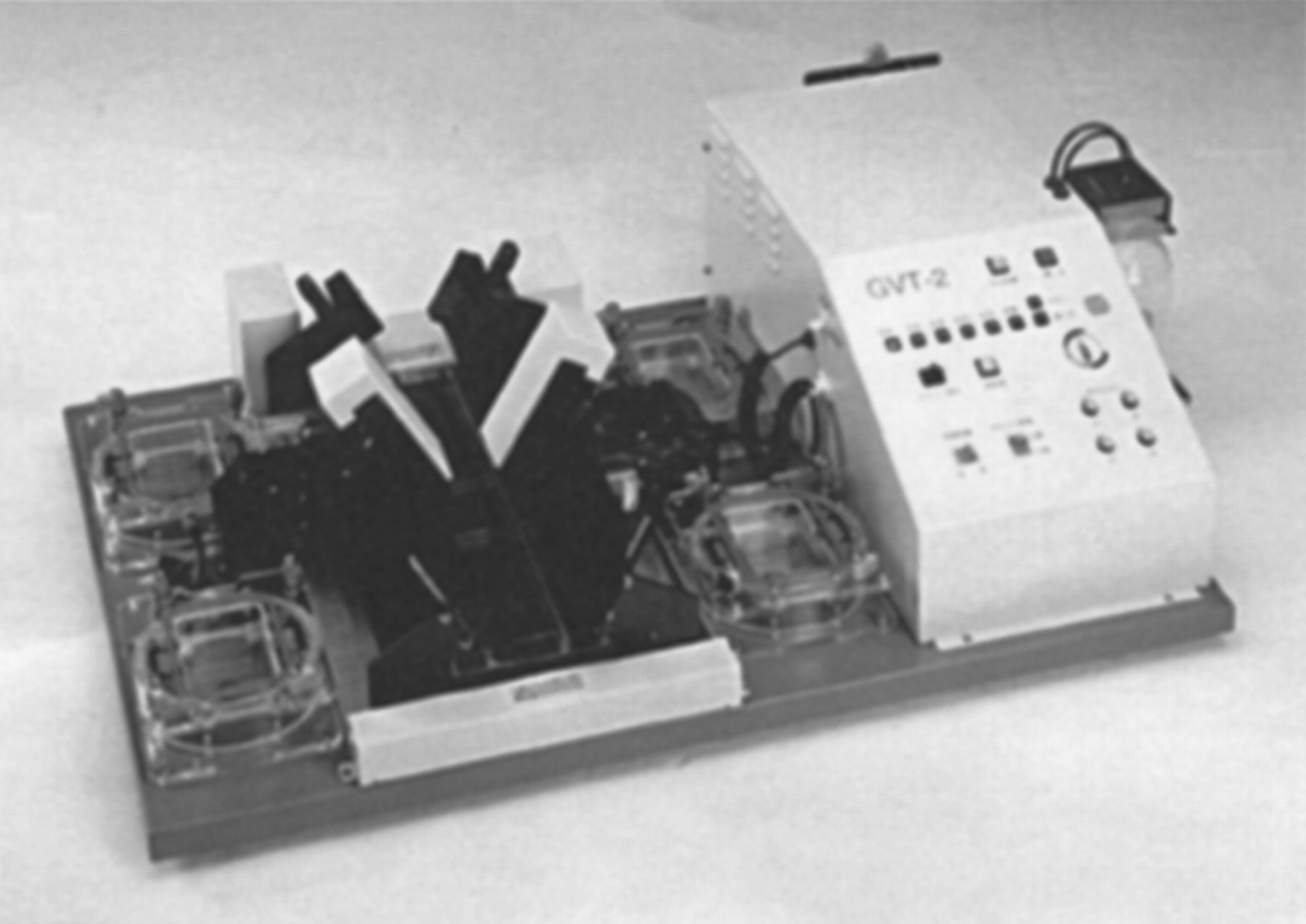 Photograph of the RISA capillary casting device. It has four chambers that are pressurized or depressurized to suck out or suck in the alkaline solution, acid solution, or water. Reservoirs for washing solutions are set on a movable stage that is controlled so that the washing step proceeds automatically.
