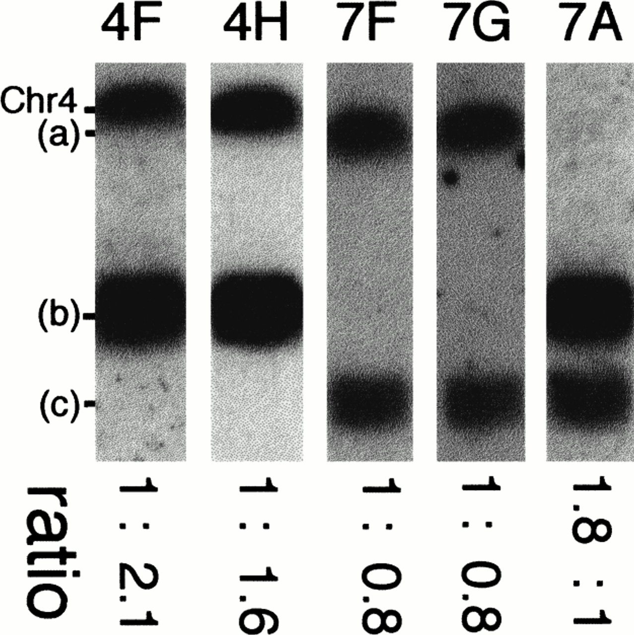 Aneuploidy of chromosome (b) in NUM1000. The chromosomal DNAs of NUM1000 were separated and transferred onto a membrane. The membrane was hybridized to OGH12, OGR9, DBP7, ARS3 and YPL12, and markers were assigned to 4F, 4H, 7F, 7G, and 7A respectively. The numbers at the bottom show the intensity ratios.