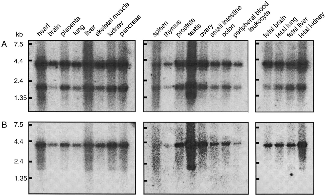 Tissue distribution of human IMPACT mRNA. Northern blot hybridization using RNAs from the indicated tissues was performed with hybridization probes derived from the ORF (A) or 3′ UTR (B) of IMPACT.