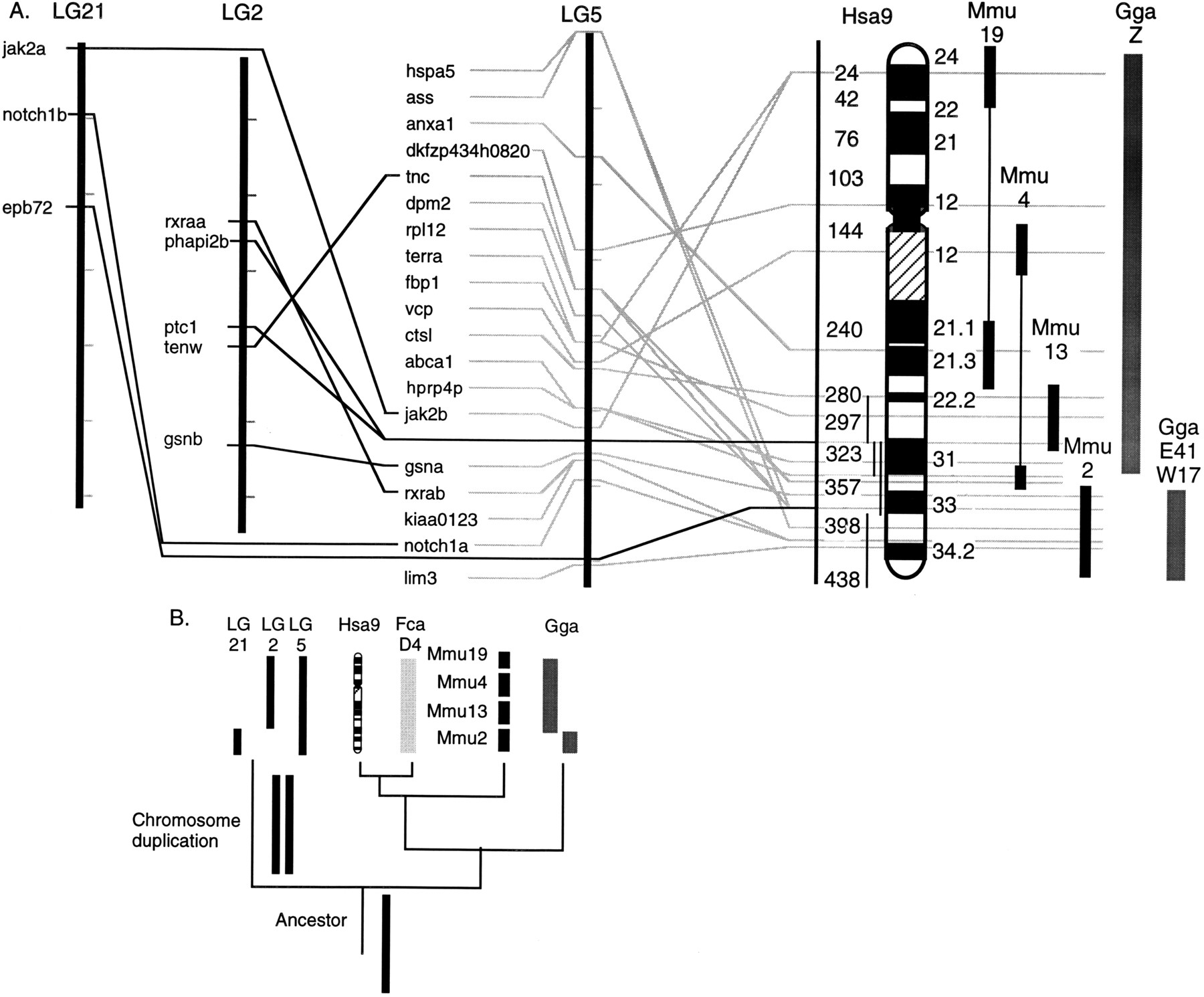 Antiquity of Hsa9. (A) Conserved syntenies and duplicate chromosome segments related to Hsa9. (B) A model for the origin of Hsa9. Accession nos. are listed in Supplementary Data at http://www.genome.org.