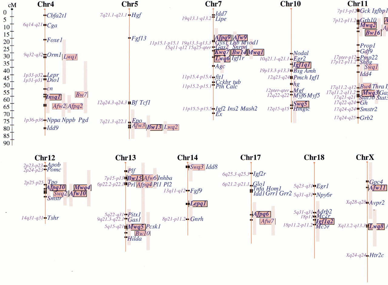 Depiction of chromosomes harboring QTLs newly identified in this study. QTL symbols of newly identified QTLs were labeled in bold text in the last column of Table 5. Shown are the chromosomal positions and confidence intervals of significant QTLs for body weight (Bw*), abdominal fat weight (Afw*), abdominal fat percentage (Afpq*), muscle weight (Mwq*), liver weight (Lwq*), kidney weight (Kwq*), spleen weight (Swq*), leptin (Lepq*), insulin (Insq*), and IGF-I (Igf1q*) relative to map positions of candidate genes for the QTL effects. Candidate genes were taken from the Mouse Genome Database (MGD), section endocrine defects, hormones, growth, and obesity (MGD), and from the Human Obesity Gene Map (Chagnon et al. 2000). The human homology is shown on the left side of every chromosome.