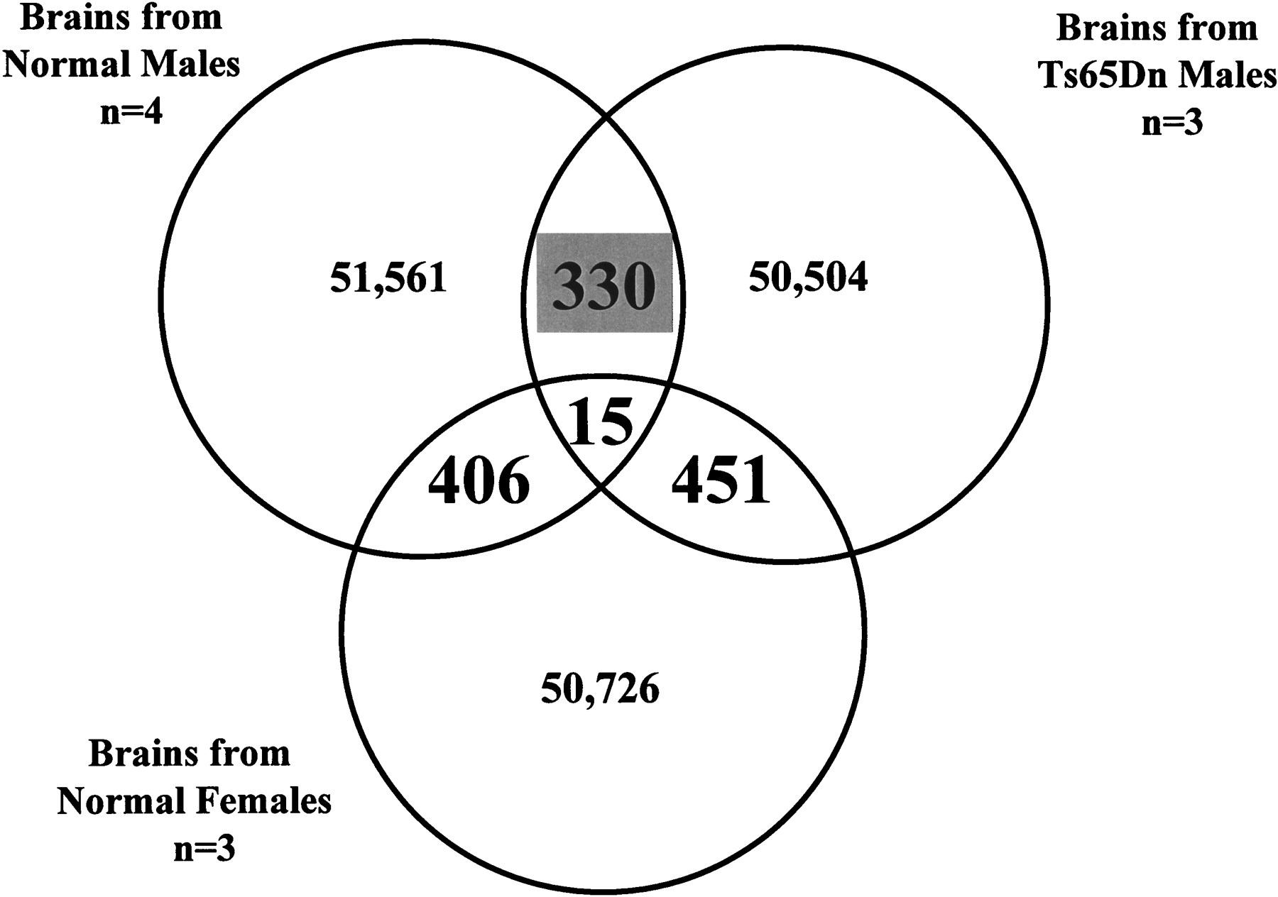Comparison of ∼50,000 tags isolated from serial analysis of gene expression (SAGE) libraries prepared from four normal male, three Ts65Dn male, and three normal female P30 mice brains. We have detected 330 tags with statistically significant differences (P ≤ 0.05) between normal and Ts65Dn male SAGE libraries, 406 differences between normal male and female SAGE libraries, and 451 differences between Ts65Dn male and normal female SAGE libraries. The complete list of tags that are overrepresented in each sample can be found in the web addresshttp://medgen.unige.ch/research/projects/SAGE/.
