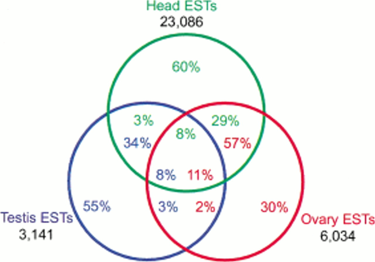 Three-way comparison of sequence matches between the testis, ovary, and head EST sets. All figure elements are color coded. 100% of testis (blue), ovary (red), and head (green) ESTs are within each color coded circle. The total number of ESTs in each collection is indicated. The color coded numbers show the percentage of ESTs from any of the three collections represented in the intersecting segments of the Venn diagram. For example, 60% of head ESTs are represented in only the head EST collection, 3% of head ESTs are represented in the head and testis EST collection, 8% of head ESTs are represented in all three EST collections, and 29% of head ESTs are represented in the head and ovary EST collections.