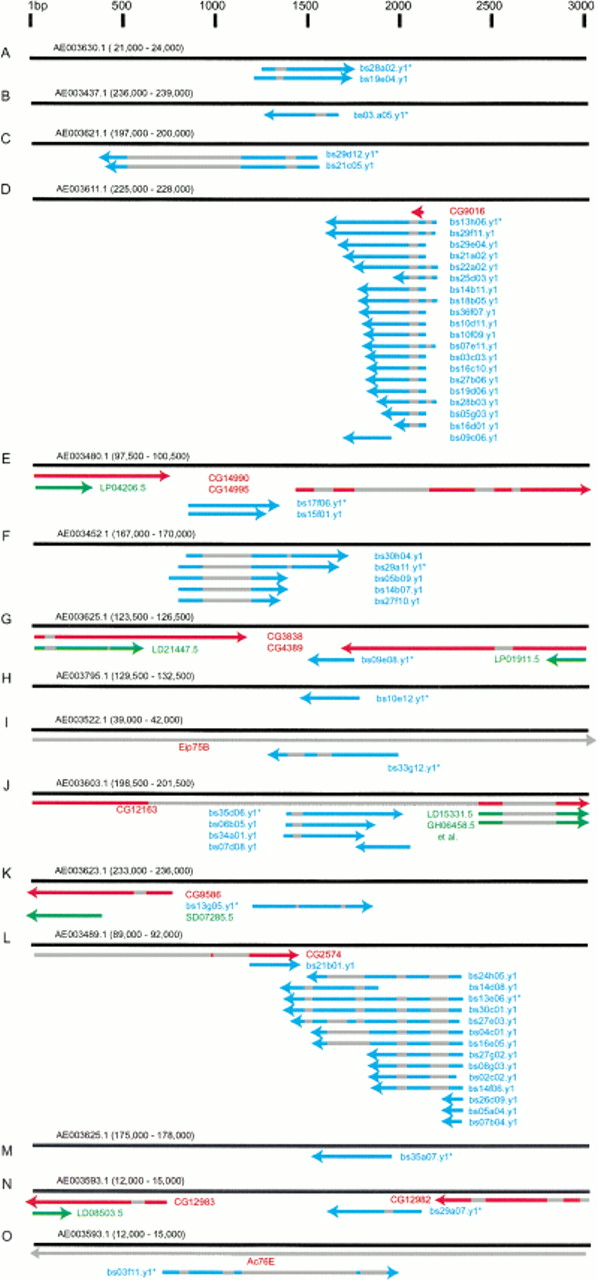 Genomic regions flanking novel, microarray verified, testis transcription units. (A-O) Diagram of sequence alignment between the indicated 3-kb genomic sequences (black bars, coordinates in parentheses, scale at top) and testis ESTs (blue bars), BDGP ESTs (green bars) and known or predicted genes (red bars). The orientation of genes and ESTs are indicated (arrowheads), as are interrupted sequence alignments (gray bars), and the representative clone printed on the microarray (*).