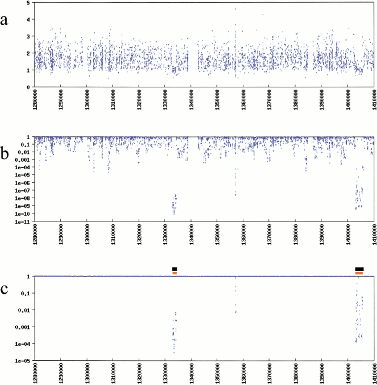 (a) Individual ratios of I PM toI MM (y-axis) plotted against genomic address (x-axis) reveal noise that masks deletions, hindering discovery. (b) The problem of identifying deleted regions is dramatically facilitated by investigating sets of tandem values using the TSTEP algorithm, which yields P values (y-axis) for each ratio. The x-axis is the same portion of the genome as in a. (c) Corrected P values, which account for testing more than 111,000 probe-pair hybridization ratios, are plotted against genomic address. Black bars indicate the regions of sequence-confirmed deletion. Orange bars indicate the regions predicted by a heuristic to assemble putative deletion intervals from P values calculated by TSTEP.