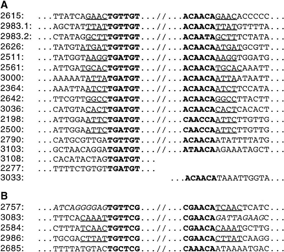 Immediate flanking regions of pi LTRs (A) andsan LTRs (B). The data are taken from assembly 4 of the Stanford database. The name of the contig on which the element lies is given at left. Flanking direct repeats are underlined. LTR sequences are in boldface. Putative PBSs and PPTs are in italics.