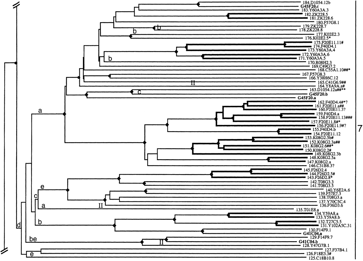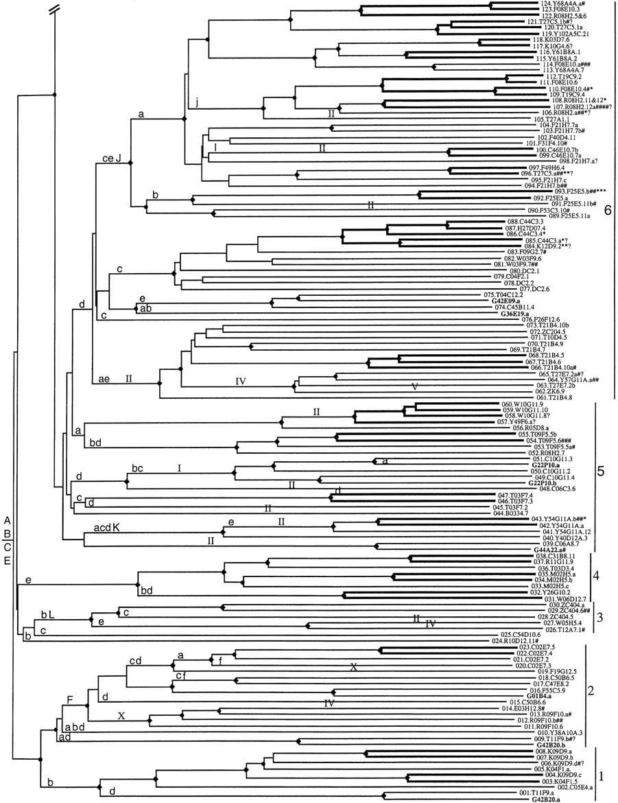Phylogenetic tree relating members of the srh family of chemoreceptors. Subfamilies are indicated on the right by numbers. Bootstrap support >95% is indicated by a diamond on the relevant node, with a smaller circle indicating bootstrap support >75%. Inferred jumps of genes from chromosome V to another chromosome are indicated by roman numerals above the middle of the relevant branch. Lowercase letters above the base of the relevant branch indicate inferred intron loss, whereas uppercase letters indicate intron gain. Double-thickness lines connect genes that are inferred to have arisen by gene duplication since theelegans/briggsae species split. C. briggsae genes are indicated by bold type, all start with the letter G, and are not numbered. C. elegans genes are assigned gene numbers in asrh− series. Pseudogene status is indicated by symbols after each gene name. (#) Frameshift or large indel; (*) in-frame stop codon; (?) loss of start codon or questionable intron boundary.