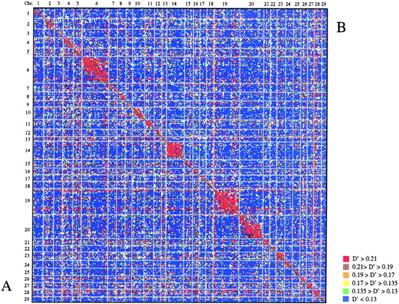 Genome-wide linkage disequilibrium map. Microsatellite markers are ordered along the X and Y-axis by chromosome and order within chromosome. Every pixel reports the D′ value for the corresponding marker pair using the shown color code. Pixels below the diagonal testing syntenic marker pairs correspond to the real data set 1 (A), whereas pixels above this diagonal correspond to the simulated data set (B).