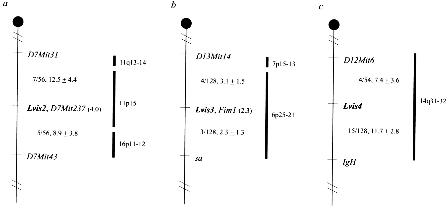Meiotic mapping of Lvis2–Lvis4. Lvis viral insertion sites were mapped using an (SB/Le × M. spretus) F1 × SB/Le interspecific backcross previously typed for multiple markers on all mouse chromosomes (Justice et al. 1990). Partial linkage maps of chromosomes 7 (a), 13 (b), and 12 (c) are depicted. Ratios of the total number of mice exhibiting recombinant chromosomes to the total number of mice analyzed for each pair of loci (with map distances in centimorgans ± the standard error) are shown to the left of each chromosome. For markers that cosegregate, the upper 95% confidence interval is shown in parentheses. The predicted map locations of human orthologs are indicated to the right of each chromosome. References and additional information regarding human map locations can be obtained from the Mouse Genome Database (http://www.informatics.jax.org/).