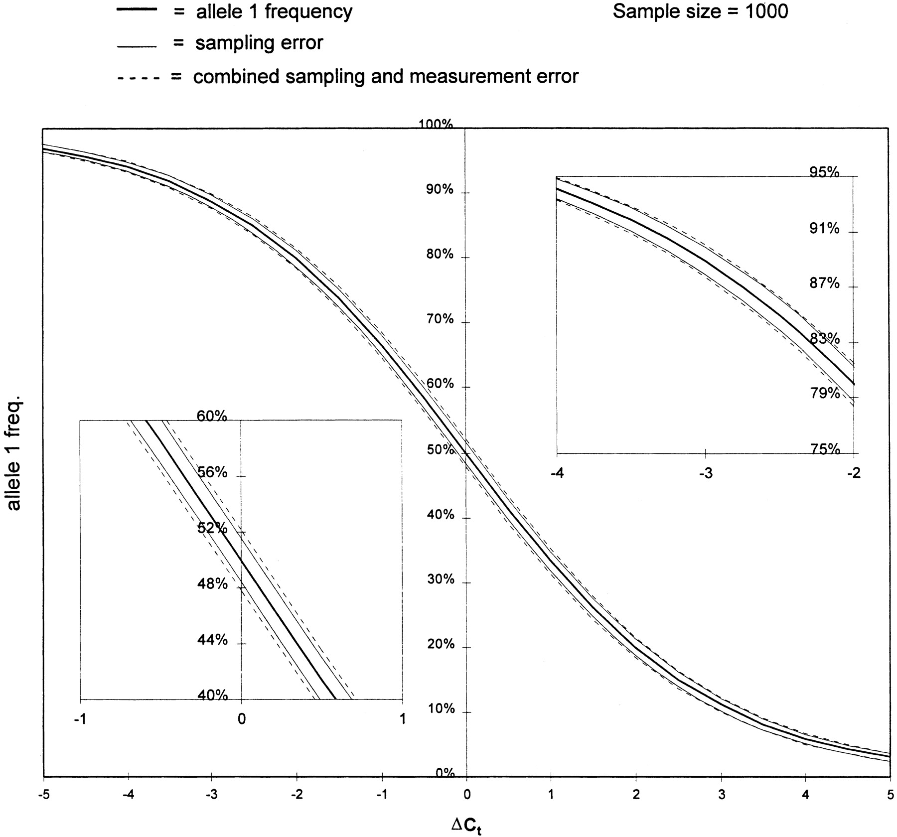 The relationship between ΔCt and allele frequency. The solid center line is a plot of equation 1 from the text. The flanking solid lines represent the expected uncertainty (1s.d.) in estimating the allele frequency based on sampling error alone (sample size = 1000). The broken lines represent the combined uncertainty of sampling and measurement error. The measurement error is based on an average error seen amongst the measurements taken in this paper and is that expected after averaging four replicate measurements. The insets compare the impact of measurement error at the middle and at the upper extreme of allele frequencies (the lower extreme should mirror exactly the upper).
