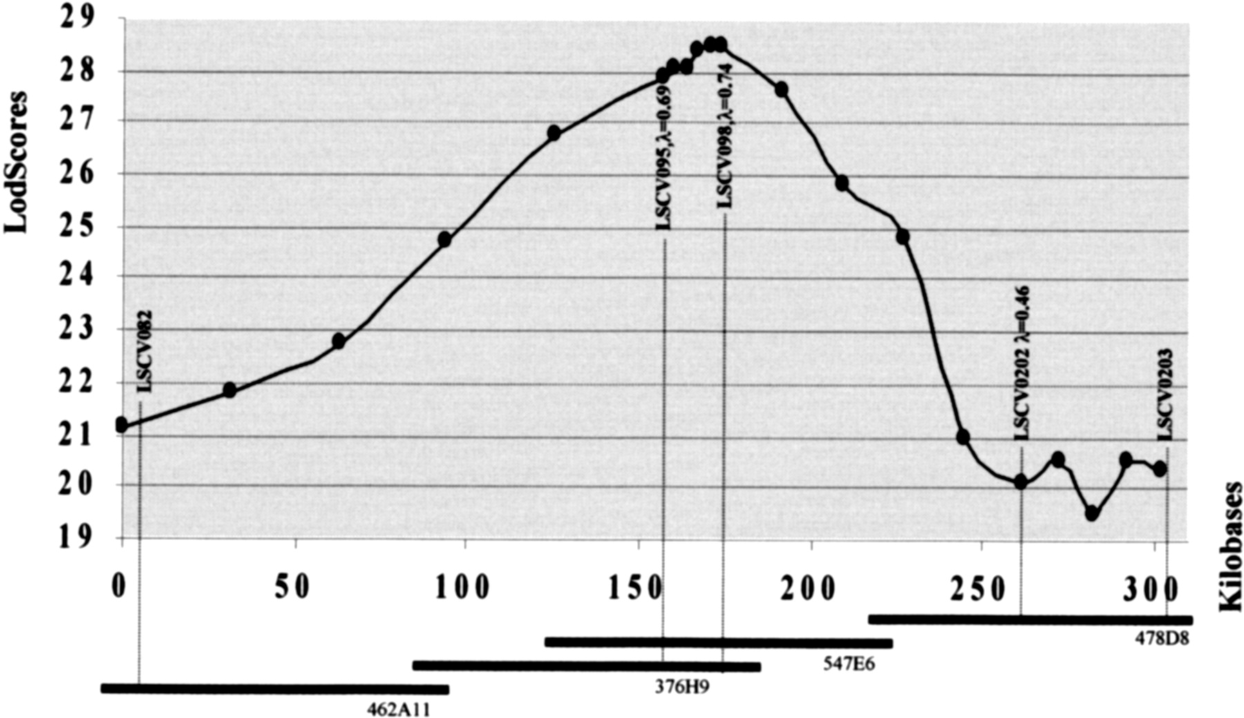 LD curves in the PIS region between markers LSCV203 and LSCV082. The curve displays a steep slope (eight lod score units) at markers LSCV095 and LSCV098. Values of λ were determined by the DISLAMB program (see text) and indicated for LSCV095, LSCV098, and LSCV202, for which significant LD was found. The four BACs of the ICC3 contig containing the five markers cover a physical distance of ∼300 kb (according to the restriction mapping profile).