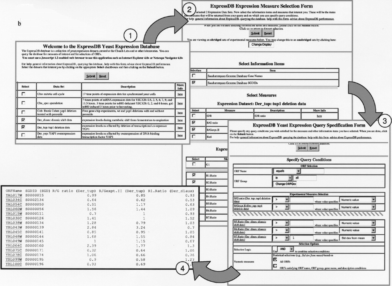 Logical flow through the EXD query system and example of EXD query. (a) Logical flow through EXD query system. Boxes correspond to forms and web pages produced by the system. Arrows correspond to movements through the system available through hotlinks and buttons on the forms and pages. Number in circles indicated forms and web pages depicted in the example of an EXD query in b of this figure. (b) Illustration of an EXD query provided to give an impression of EXD system usage. (1) A user selects two data sets from the database, (2) selects an information field (SGDID) and nine Measures from these data sets, (3) specifies a query condition, and (4) obtains results. Forms and web pages shown in diagram are versions of actual EXD pages that have been reduced in size, abridged, and edited to highlight key features. Details pertaining to the example are given in the text.