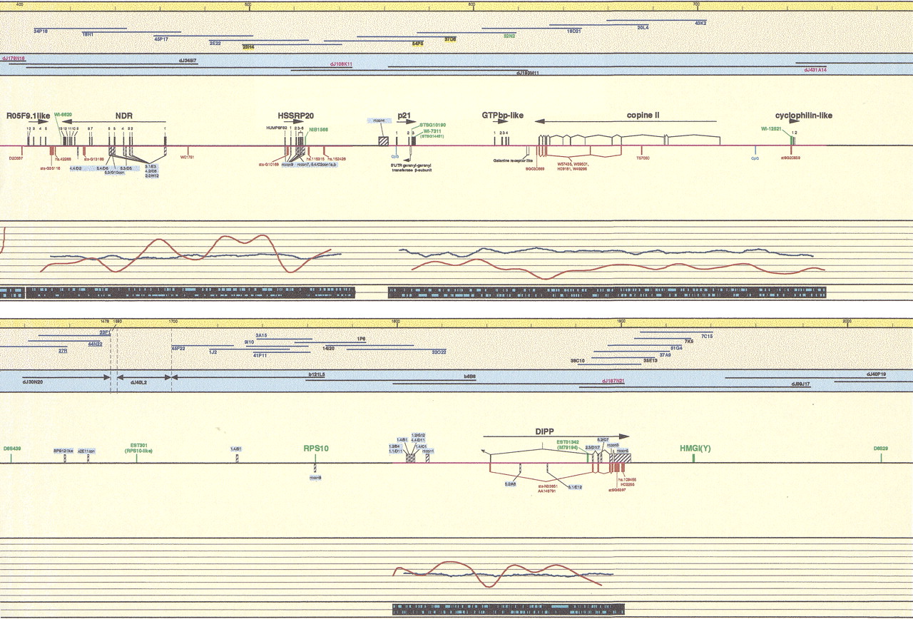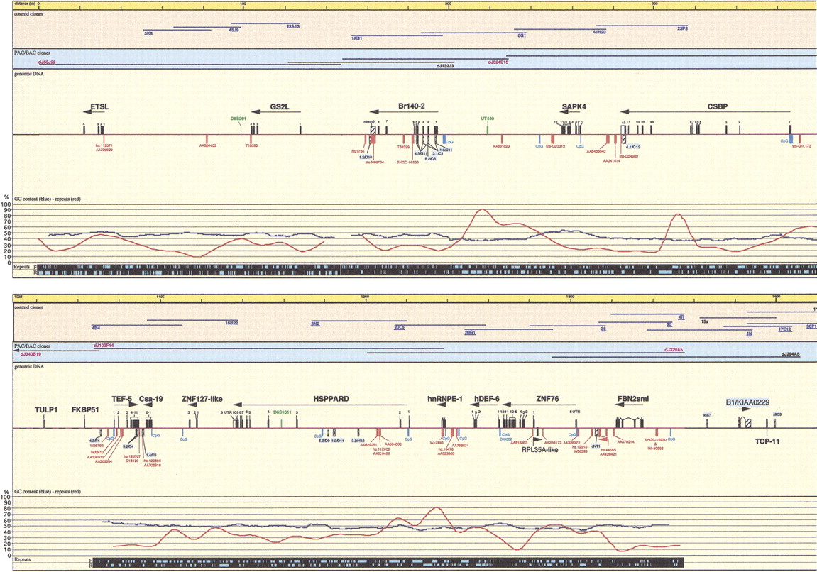 Schematic representation of the transcript map of the 6p21.2–6p21.3 boundary region, immediately centromeric of the MHC. All physical distances are indicated in the top bar as kilobases and thin lines represent 20-kb intervals. Only the relevant minimal number of clones is indicated. Blue cosmid names were used in cDNA selection, underlined in exon trapping, yellow highlighted in isolation of GC rich fragments. PAC/BAC clones are indicated with black lines (prefix dJ for PACs). Clones are drawn to scale. PAC dJ40L2 is extending on either side, as the arrows indicate. Sequenced clones are indicated in red. PAC dJ340B19 is only partially sequenced; therefore, the location of the identified transcripts is tentative. The genomic DNA shows sequenced parts (red lines). (Black boxes) Mapped and predicted exons; (red boxes) mapped ESTs and Unigene contigs; (light blue boxes) predicted CpG islands; (green boxes) genetic markers; (hatched boxes) selected cDNA clones, cDNA contigs, and exons (names with blue background); (open boxes) 3′ and 5′ untranslated regions (all drawn to scale). Linking lines were used to indicate multiple matches of EST and cDNA contigs on the genomic sequence and to denote linked exons, where this is not obvious. Numbers above black boxes indicate the relevant exon number. The names of genes are indicated above the exons; the arrows show the orientation of transcription. The percentage of GC (blue graph lines) and percentage of repeats (red graph lines) are indicated under the sequenced genomic DNA and in the last black stripe the exact position of repeats is indicated as turquoise boxes for the Forward and Reverse strand. Position 0 is the true centromeric end of PAC clone dJ50J22.