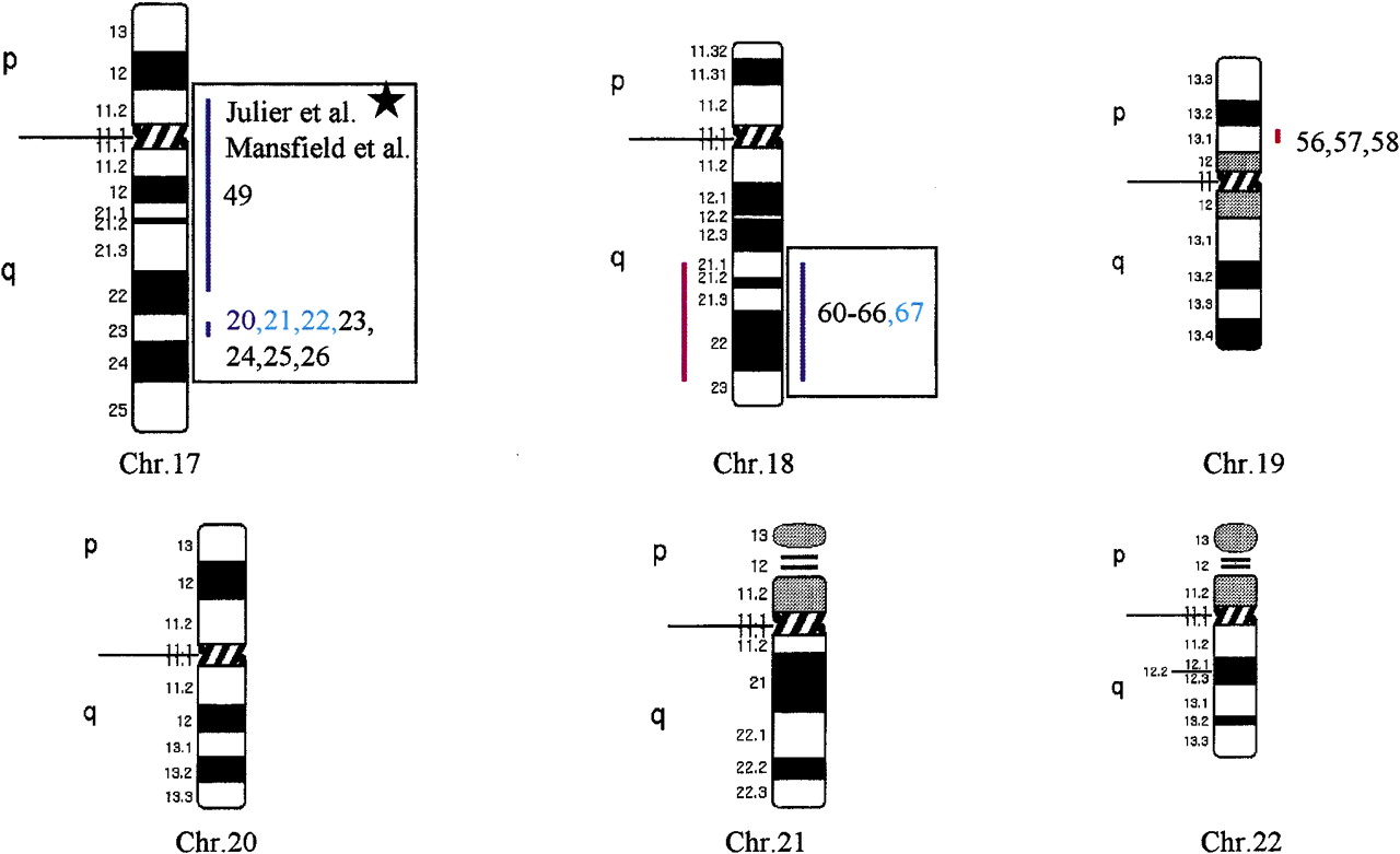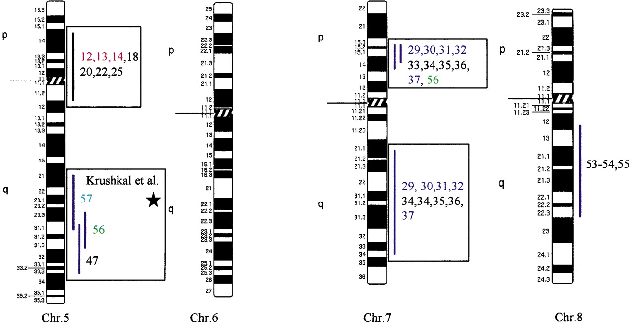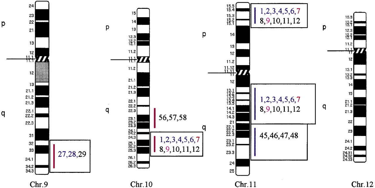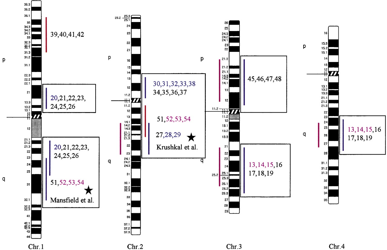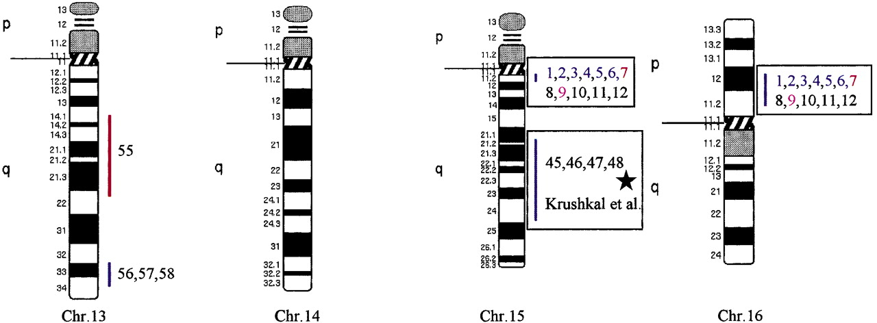 Human chromosomal regions implicated in hypertension based on rat–human comparative maps for 67 QTLs identified in seven different progenies from genetically hypertensive rats. Distribution of the 26 predicted genomic regions in the human genome located on 16 different autosomes based on cytogenetics. Human chromosomes 6, 12, 14, 20, 21, and 22 do not contain positional candidate loci predicted by the rat studies, and the sex chromosomes were not evaluated in this study. Regions of the genome in which multiple blood pressure-related phenotypes cluster from more than one cross are designated first priority regions. There are 20 of 26 regions that fall into this category (boxed regions). We predict six “second priority regions” based on QTLs identified in a single rat cross that may represent either areas of interest for a distinct subtype of hypertension or areas harboring modifier genes for blood pressure (nonboxed regions). Confidence level for placement of syntenic regions designated by vertical bars: (Red) Highest, (blue) high, (black) moderate. Numbers: (Black) SHR × BN, (purple) SS/MCW × BN, (blue) SHR × WKY, (red) SHR × DRY, (dark green) ACI × FHH, (light green) GH × BN, (magenta) LH × LN. Mouse syntenic QTLs are represented by the vertical bars to the left of the human idiograms. (Star) Genomic region reported with significant or suggestive linkage in genome scans for hypertension in humans.