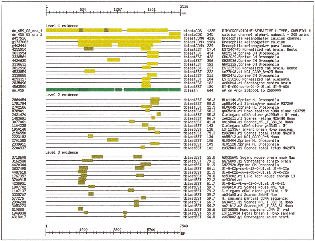 Evidence shows missing and mispredicted exons for the calcium ion channel protein. The first gap in the first row indicates that exons from the next predicted gene should be merged with the calcium-ion channel gene.