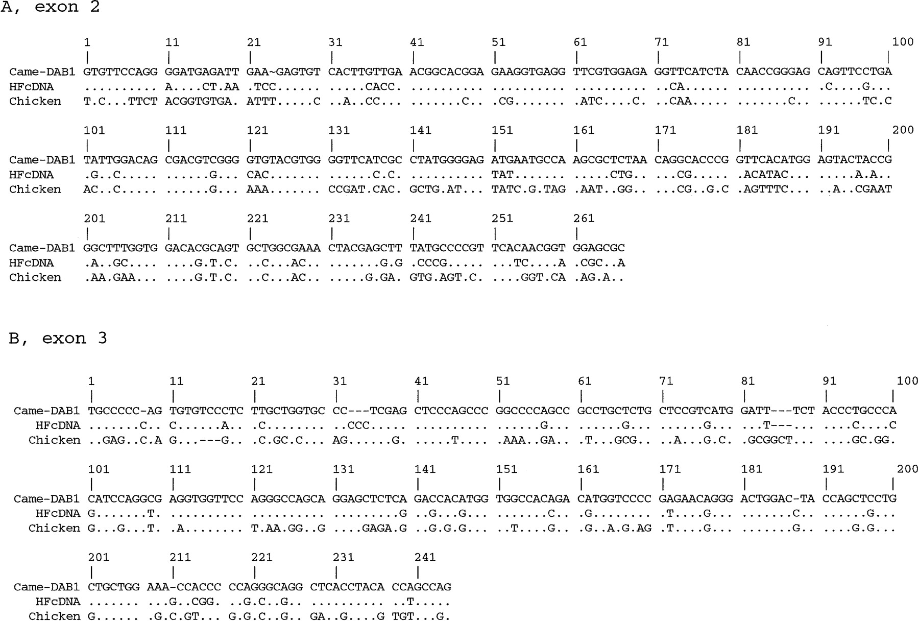 Alignment of Came–DAB1 exon 2 (A) and exon 3 (B) to a highly polymorphic chicken gene (B-LBI;Zoorob et al. 1993) and a house finch cDNA sequence (Edwards et al. 1995a). Deletions are indicated in the sequences by a − mark.