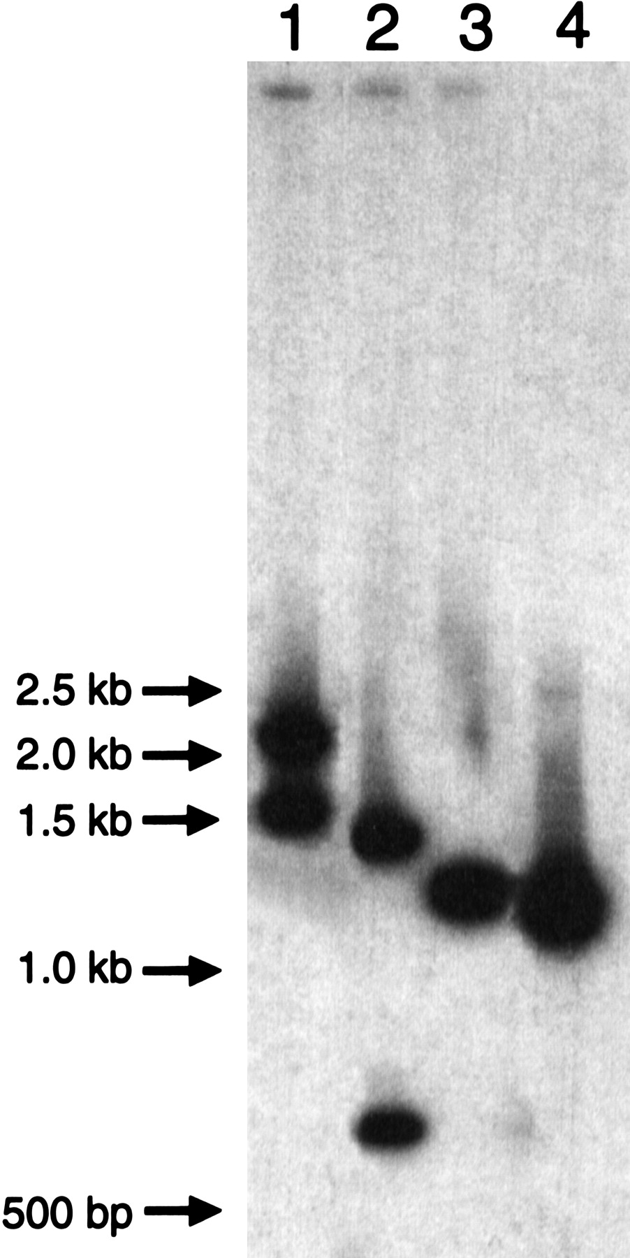 Southern blot analysis of a Saoe-DRB11*0102 intron 1 clone. The clone was digested with different pairs of restriction enzymes. The digests were separated by gel electrophoresis, blotted, and the blot hybridized with an Alu-specific probe. (Lanes 1–3) Digests obtained after treatment with theBamHI/HindIII, HindIII/HincII, andBamHI/EcoRI enzymes, respectively.(Lane 4) Positive control. A 1.2-kb fragment containing Alu50J was amplified from human genomic DNA and blotted.