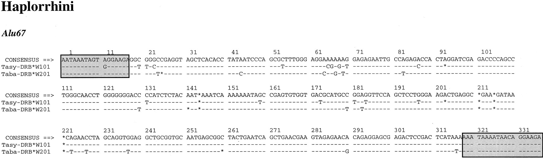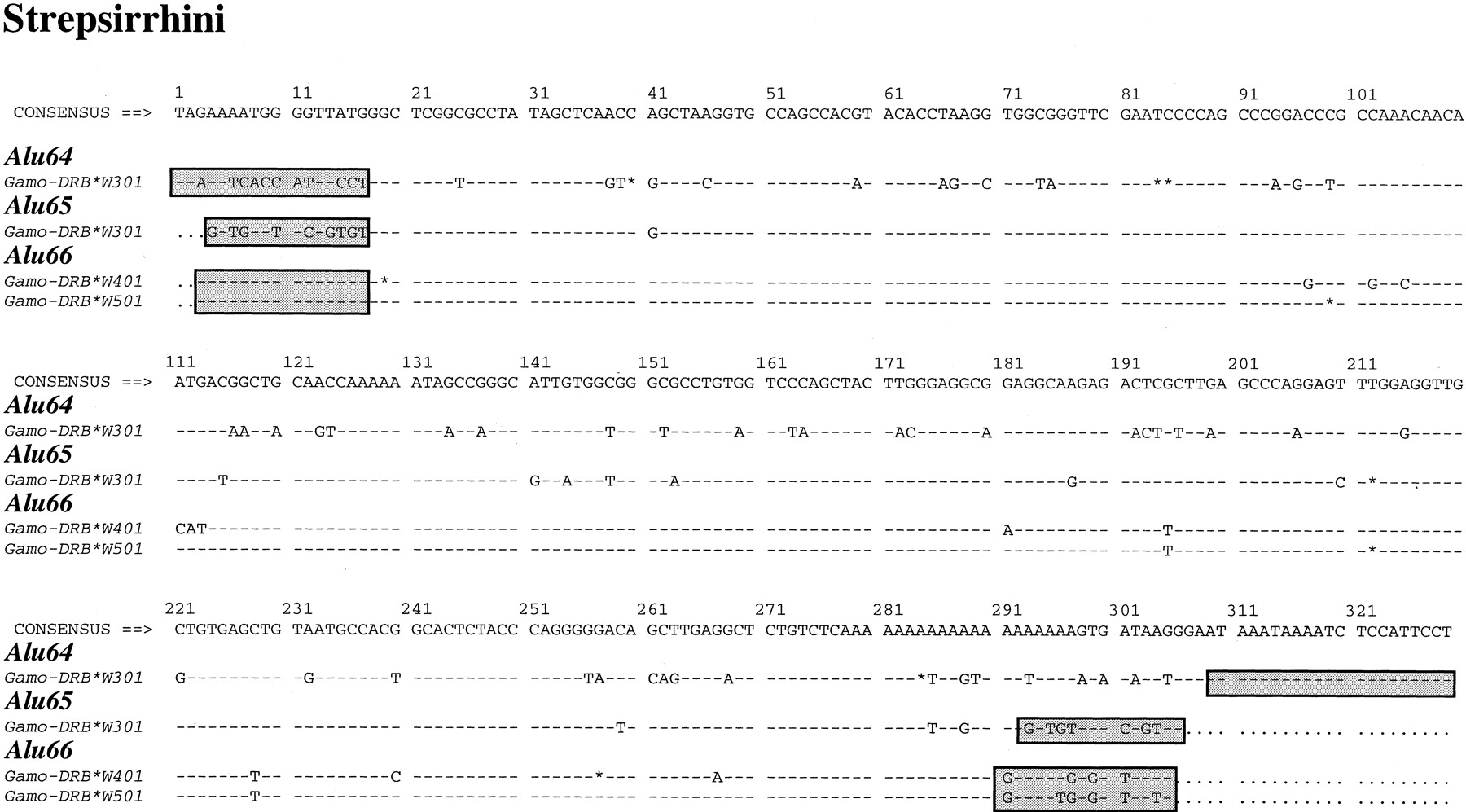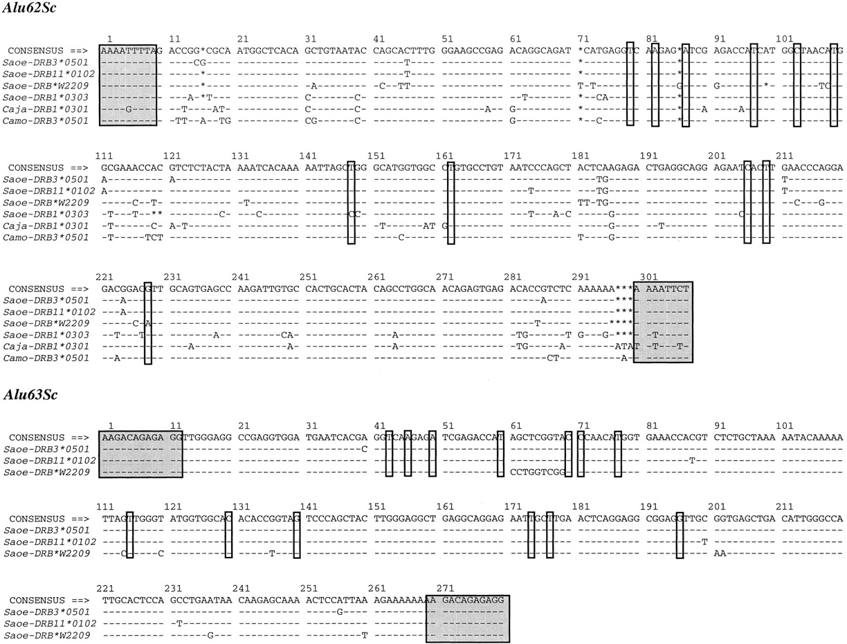Nucleotide sequence alignments of the Alu elements identified in the DRB genes of platyrrhini, strepsirrhini, and haplorrhini. The shaded boxes represent the flanking direct repeats that are created during the insertion of the Alu element. InAlu62 and Alu63, the diagnostic positions used for the subfamily classification are highlighted. A simple majority consensus sequence is given at the top. A dash (-) indicates identity with the consensus, an asterisk (*) an indel, and a dot (.) unavailability of sequence information. Numbering above the sequences starts with the first nucleotide of the alignment.