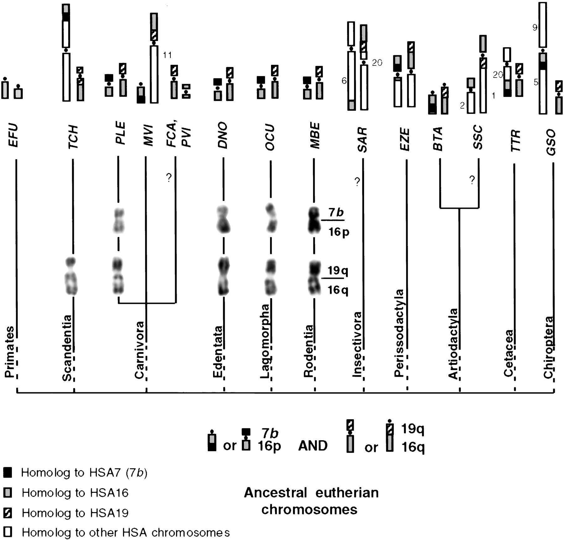 Reconstruction of the presumed ancestral chromosomes homologous to HSA16 (bottom) in placental mammals, their present status in living species (top), and their syntenies with HSA7 and HSA19 sequences. Expected but not observed syntenies 7b–16p by Zoo-FISH are indicated by a question mark. (See Table 1 for the three-letter code meaning.)