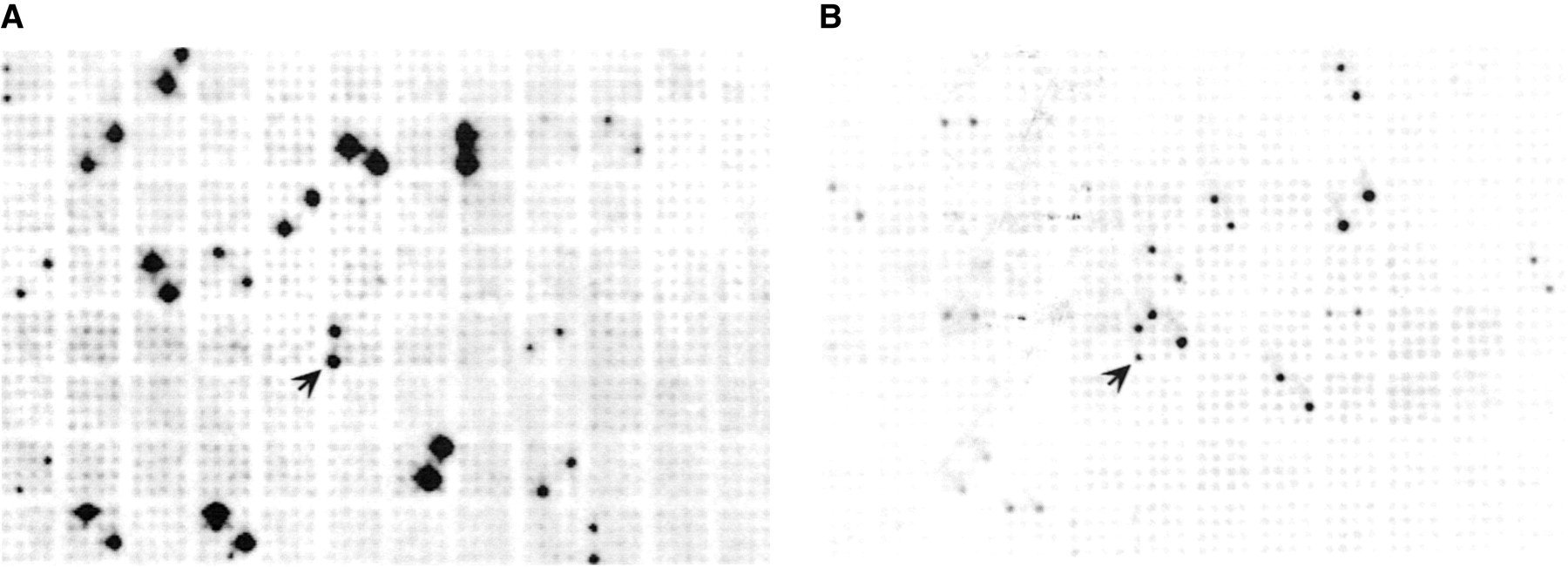 Two-dimensional hybridization. (A) Probe pool, column 17 of the Whitehead group; filter number 5. (B) Probe pool, row 6 of the Whitehead group; filter number 5. Arrows point to the same positive clone hybridized with the two pools. The overgo probe in common at the intersection with the two pools is WI-14879.