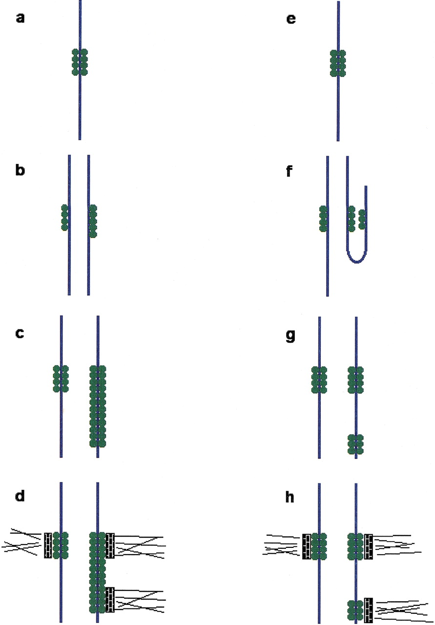 Neocentromeres can arise processively. In (a), a centromere is denoted by association of an epigenetic mark (green circles) with the chromosome (blue lines). In (b) the DNA is replicated, and the mark associates with both chromatids. As the mark is templated to the newly synthesized strand (c), there is some incorporation onto non-centromeric DNA that juxtaposes the centromere. This allows the centromere to increase in size, or to move along the chromosome. Finally, in metaphase (d), kinetochores (blocks and thin lines) are nucleated onto marked DNA, causing dicentric formation on the progenitor to mardel(10). Alternatively, spreading may occur in trans. In (e), the centromere is marked and has sharp boundaries. During or after replication (f), there is a transient interaction between the centromere and an unrelated locus on the same or a different chromosome. (g) Templating of the centromere identity mark assures that this ectopic centromere matures, just as the endogenous centromeres do. Both centromere and neocentromere are capable of nucleating a kinetochore (h), resulting in a dicentric chromosome which undergoes breakage-fusion-bridge during cell division (McClintock 1938).