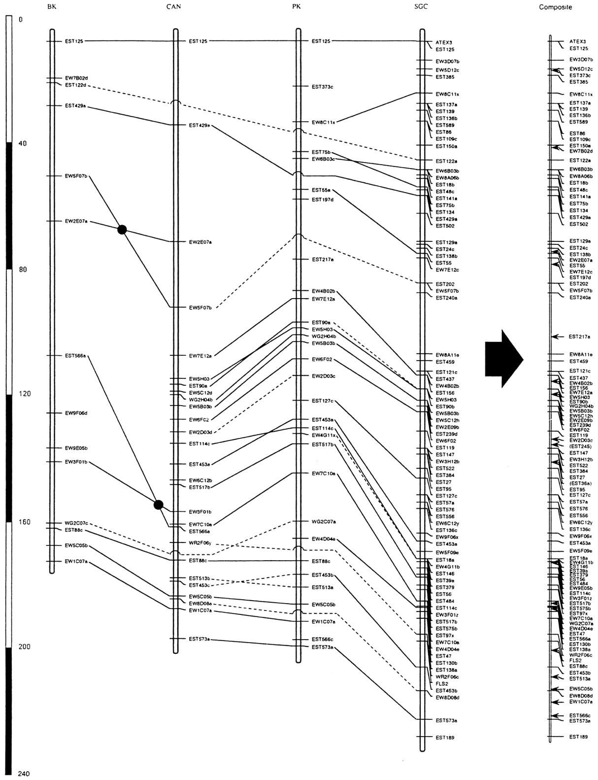 The assembly of the Brassica chromosome 1 composite map. Common loci (based on common restriction fragment sizes) were connected by solid lines, putatively homologous loci (with different restriction fragment sizes, but at corresponding sites) are connected by dashed lines. Filled circles placed on crossed lines indicate that respective orders of loci are statistically significantly different (≥LOD 2.0) in the respective maps, suggesting possible chromosomal rearrangements. Arrows indicate the inferred locations of unique loci in the consensus map.