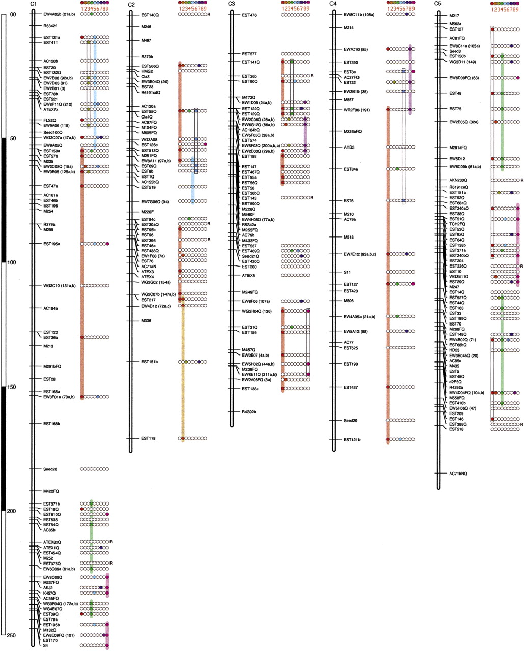 Composite RFLP linkage map of Arabidopsis thaliana HM x WS and M13 x WS F2 populations. Markers designated “FQ” are anchor loci, common to both populations. Markers mapped in the HM x WS population are designated “Q”. The remaining markers were mapped in M13 x WS only. The construction of the A. thaliana composite map was as reported previously (Kowalski et al. 1994a). It should be noted that integration of data from two populations tends to inflate recombinational distance due to unequal recombination between populations. The filled circles next to the loci indicate homoeologous loci detected by the same probe on the Brassica composite map. Open circles indicate that no polymorphism was detected for homoeologous loci in RCB x GC Brassica populations. The letter “R” next to a probe name indicates that it hybridizes to a repetitive DNA sequence in the Brassica genome. Specific colors are asigned to each homoeologous chromosome. Markers included in the one-to-one model for Arabidopsis-Brassica correspondence are connected by filled columns. Open columns indicate possible duplicated regions in Brassica.