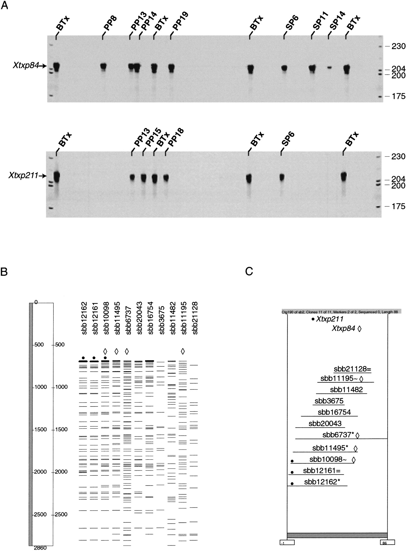 PCR-based screening of BAC DNA pools for SSR markers. (A) BAC DNA plate pools (PP) and side pools (SP) were analyzed for the presence of two SSRs, Xtxp84 and Xtxp211. BAC DNA pools positive for a given SSR are identified above the respective lane. Plant genomic DNA (BTx623) was used as PCR template in control lanes labeled BTx. Fluorescent-labeled molecular weight standards (LI-COR) were loaded in the first and last lanes and their sizes (bp) are indicated to the right of the gels. (B) FPC V4.5 fingerprint analysis window displaying the representative fingerprint patterns of individual BAC clones from ctg190. Four BAC clones in ctg190 were identified as positive for Xtxp84, and three BACs were identified as positive for Xtxp211 (·) following analysis of the BAC DNA pools from A. (C) FPC V4.5 contig window displaying a horizontal representation of ctg190 that contains BAC clones positive for Xtxp84 and Xtxp211. The characters (*, = and ∼) to the right of individual clone names represent canonical, equal, and approximate clones, respectively (Soderlund et al. 1998). The shaded bar below the contig display indicates the length of the contig, measured in number of bands.