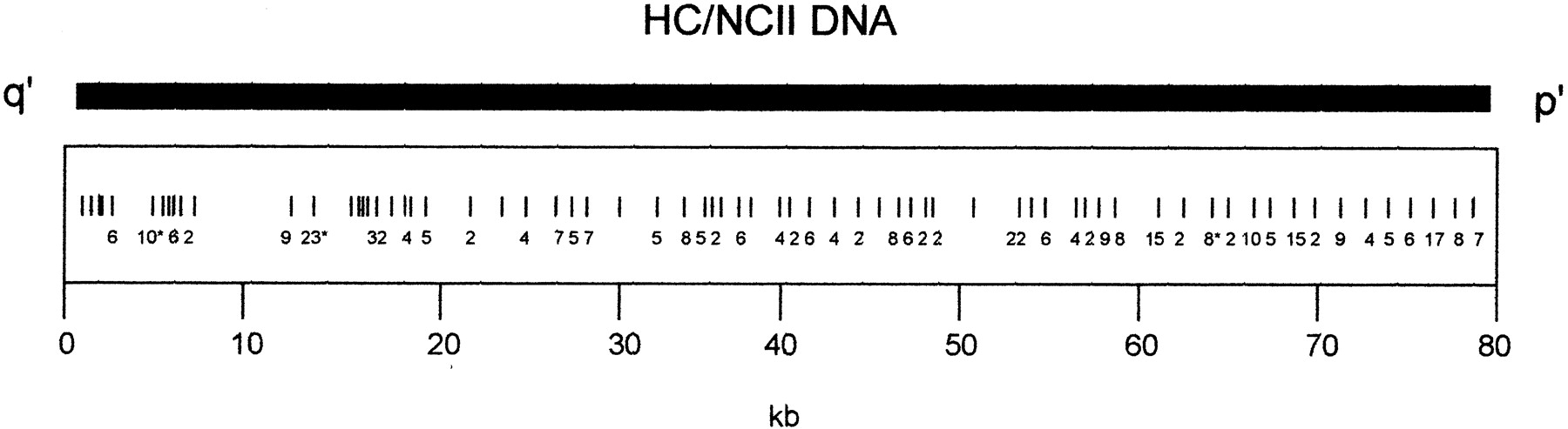 Differences between the ∼80-kb HC and NCII sequences. Vertical bars represent the positions of single nucleotide differences between the two sequences. The numbers below represent the number of single nucleotide differences (where there is more than one difference) over a 1-kb region. Numbers with asterisks represent clusters of differences.