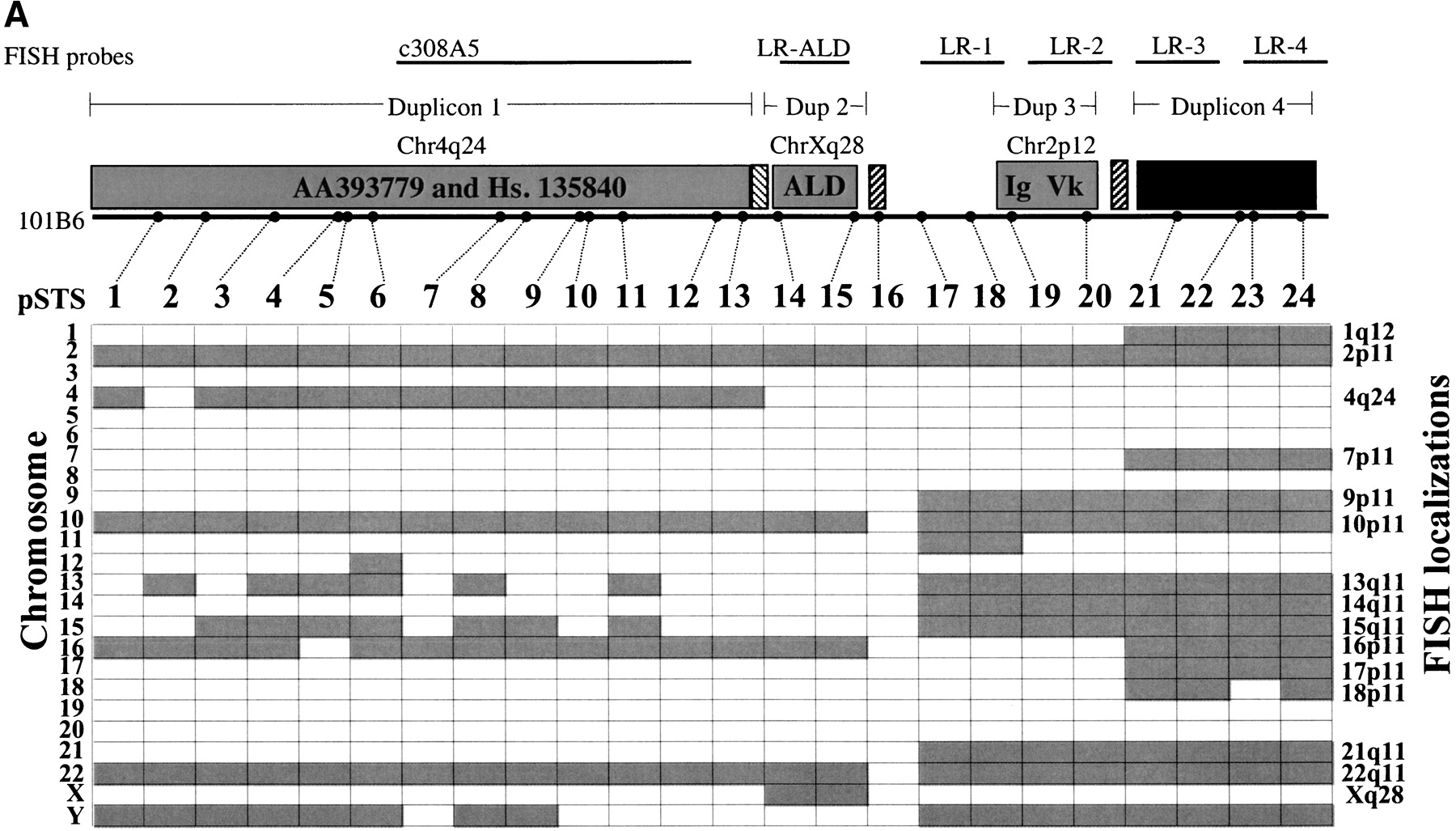 Paralogy map. (a) Summary of PCR and FISH analysis of 101B6. Each column describes the PCR results of one primer pair tested against a panel of 24 monochromosomal somatic cell hybrid DNAs. A total of 24 paralogous STS (pSTS 1–24) primer pairs were developed based on the 101B6 reference sequence. Dots along the top line indicate the approximate position of each primer pair in 101B6 (see Table 3 for the exact location of each primer). The filled gray boxes indicate chromosomal hybrids tested positive by PCR and, therefore, represent the extent of paralogy of each chromosome with respect to the 2p11 reference sequence. As expected, only chromosome 2 tested positive for all pSTS. A schematic of the duplication organization (see Fig.3) of the 2p11 sequence is provided. The positions of long-range PCR (LR-ALD, LR-1 to 4) and the cosmid (c308a5) probes used in FISH assays are indicated. FISH localizations are summarized on the right sideof the figure. These confirm the interchromosomal distribution and cytogenetic position of each pSTS. (b) The number of observed interchromosomal duplications is plotted (y axis) against the position of each paralogous STS. The mean number of duplications is calculated for three groups (X 1=duplicon 1 and 2,X 2=duplicon 3, and X 3=duplicon 4). A significant difference is observed for each pairwise comparison of the means (P < 0.001; two-tailed test; unequal variances).