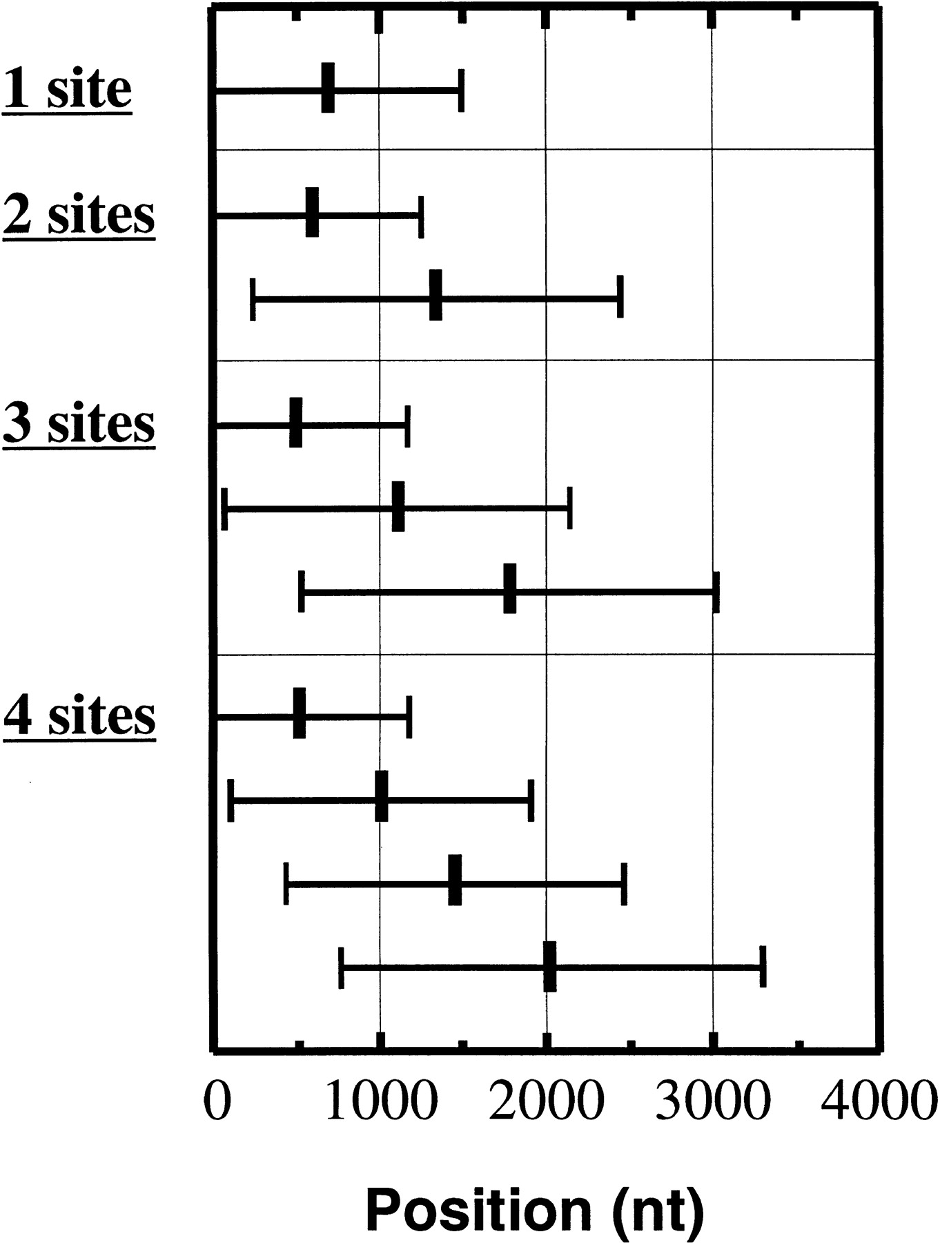 Average position of observed polyadenylation sites on 3′ UTRs in function of the number of observed alternate sites. From top to bottom: mRNAs with a single poly(A) site identified (3377 RNAs), mRNAs with two poly(A) sites identified (724 RNAs), mRNAs with three poly(A) sites identified (182 RNAs), and mRNAs with four poly(A) sites identified (43 RNAs). Position 1 on the X-axis is the first base following the Stop codon. Error bars indicate standard deviations.
