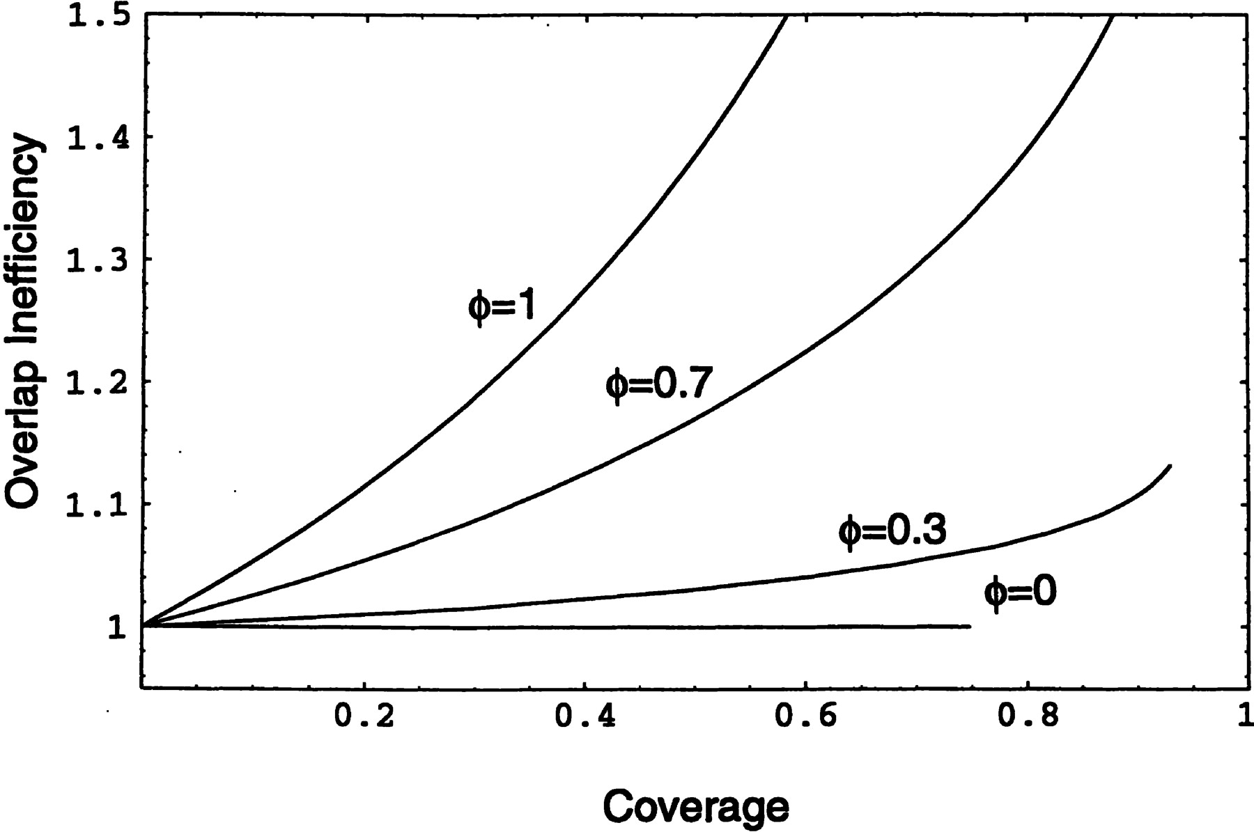 Overlap inefficiency of parking. Overlap inefficiency is the ratio of the sum of the lengths of the clones sequenced to the length of unique target sequence produced. There is no such inefficiency for strict parking with no allowed overlap (φ = 0). Overlap inefficiency and coverage are parametrically related as functions of time ν; the resulting curves do not extend beyond their respective jamming limits. The curve for φ = 1 corresponds to the Clarke-Carbon equation.