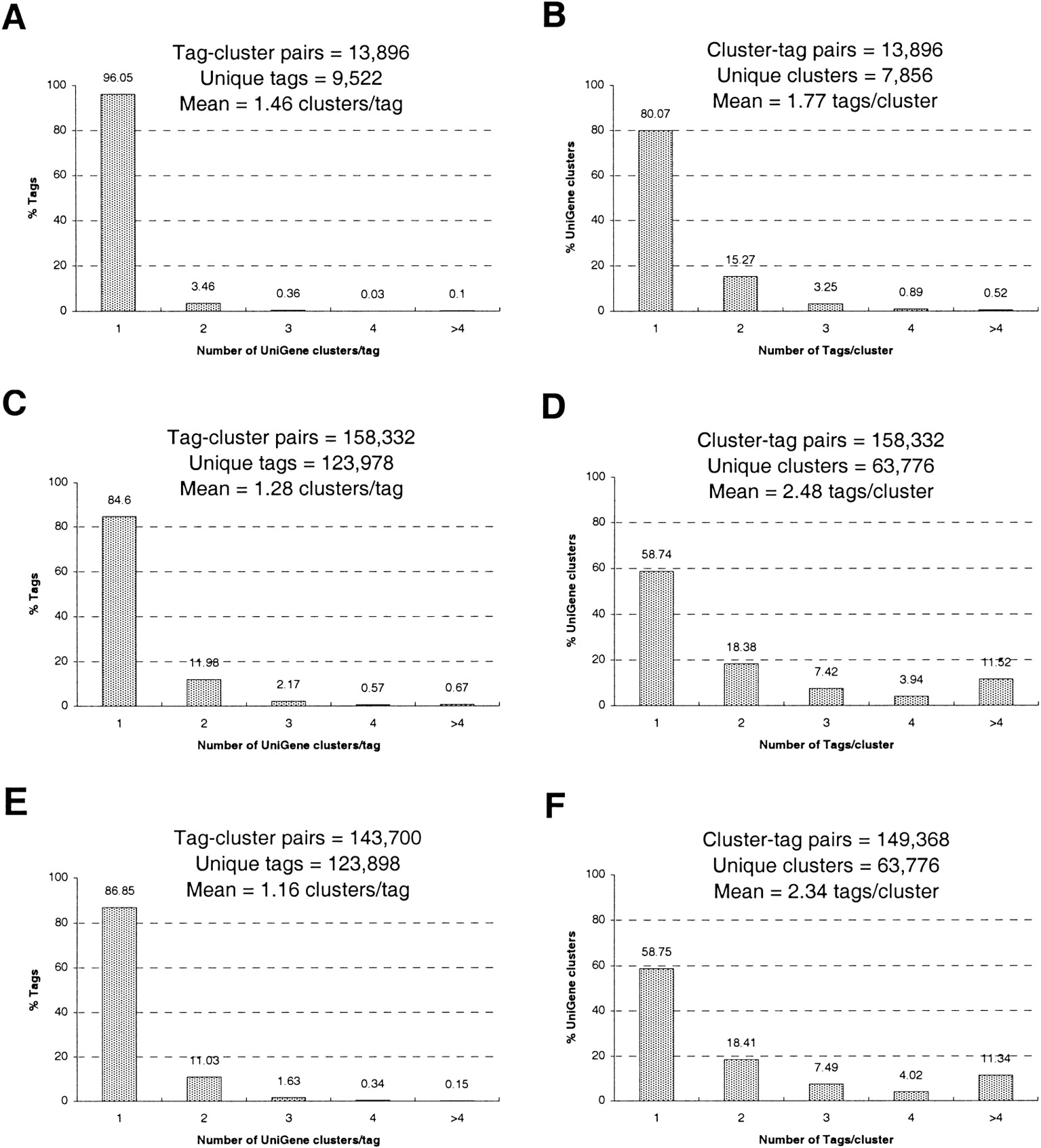 (A,B) The percent distributions of the tag-to-gene and gene-to-tag mappings, respectively, from October 1999, for well-characterized mRNA/cDNA sequences only (i.e., no EST sequences). (C,D) The distributions for the “full” mappings (including data from tags paired to UniGene clusters). (E,F) The distributions for the “reliable” mappings (see text).