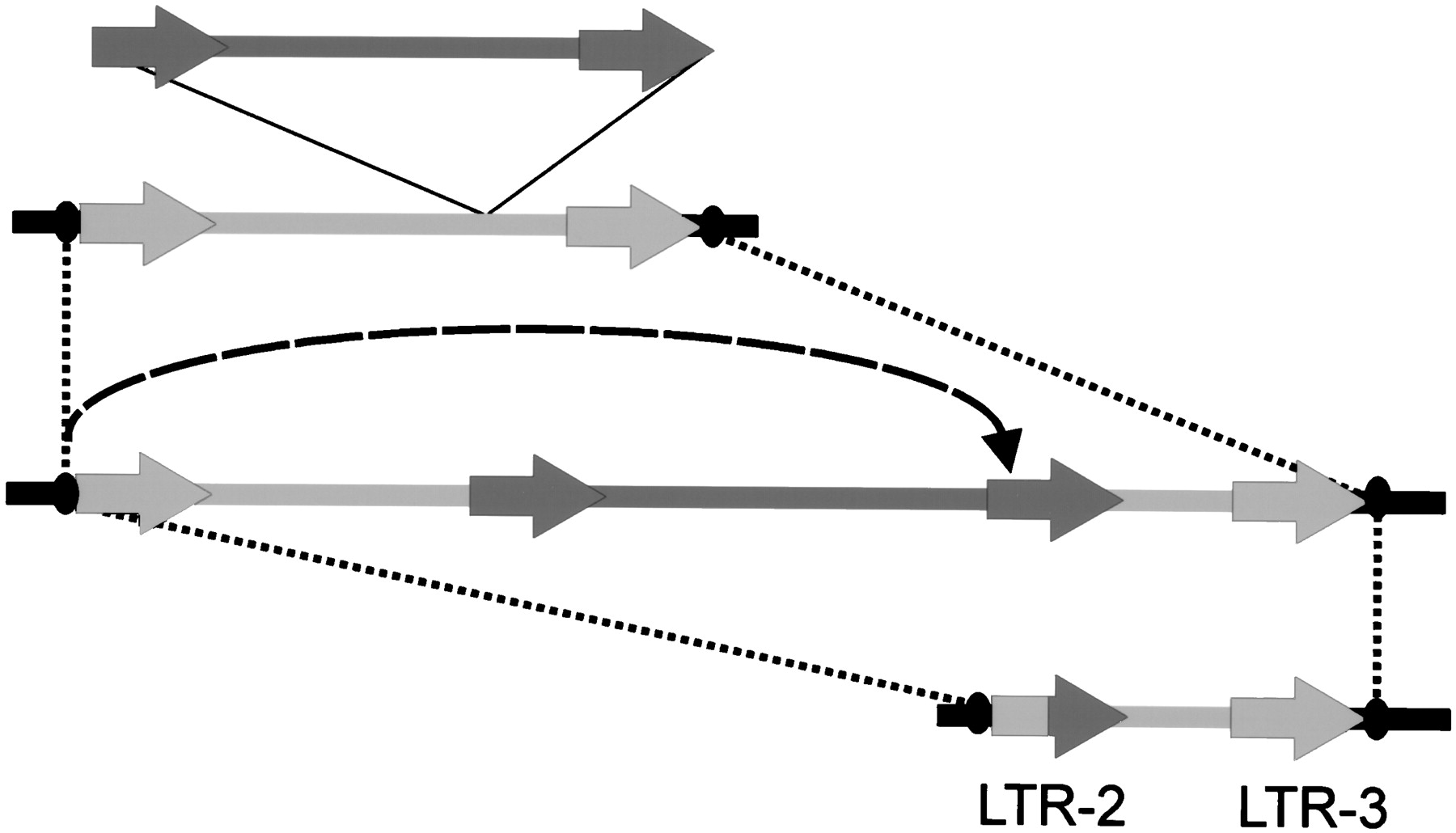 Possible integration and recombination events generatingSabrina unit LTR-2 — LTR-3. Two Sabrina elements are shown in dark and bright gray with the arrows denoting the LTRs. Nonelement DNA is in black with the ovals representing 5-bp direct repeats flanking Sabrina LTR-2 and LTR-3. The broken arrow line shows a deduced intraelement recombination event; dotted lines indicate corresponding positions; thin black lines denote a nestedSabrina insertion.